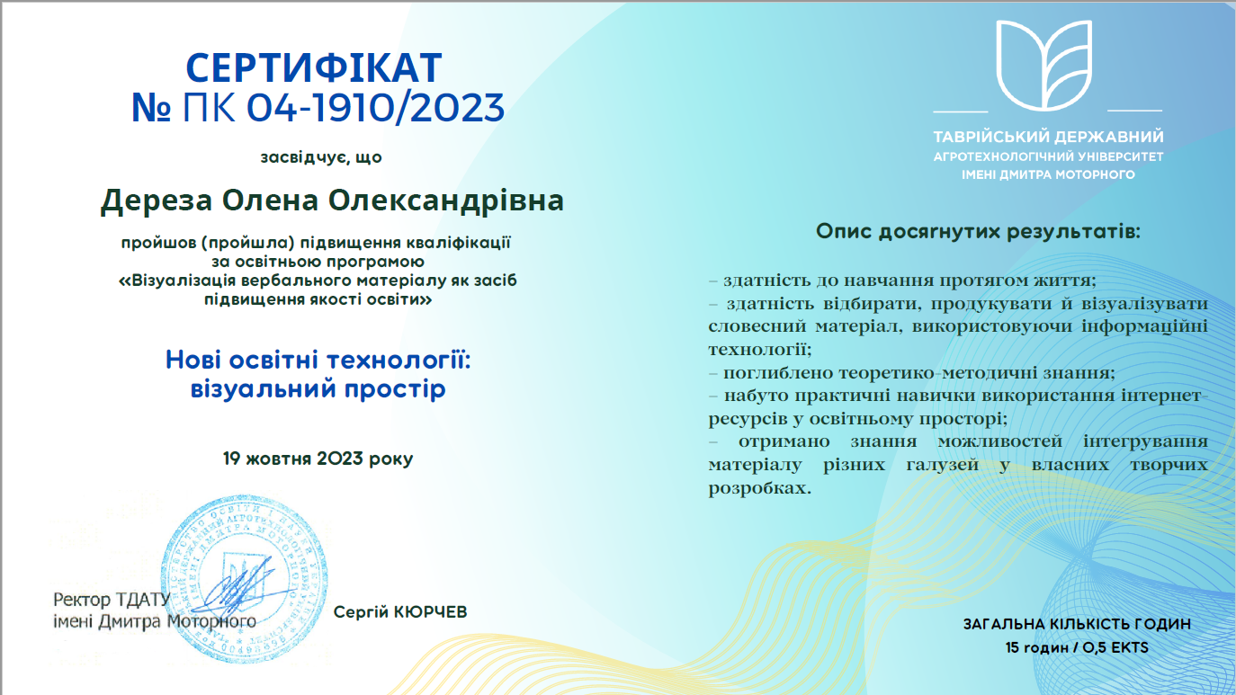 Таврійський державний агротехнологічний університет імені Дмитра Моторного (м. Запоріжжя, Україна). Сертифікат про підвищення кваліфікації № ПК-041910/2023 від 19.10.2023 р. Тема «Нові освітні технології:візуальний простір», обсягом 15 годин (0,5 кредиту ЄКТС)