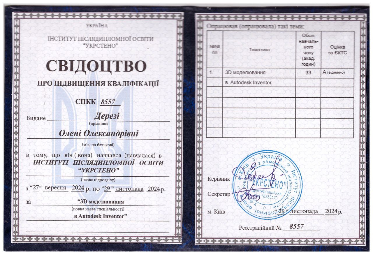 Інститут післядипломної освіти «УКРСТЕНО» (м.Київ, Україна). Свідоцтво про підвищення кваліфікації №СПКК 8557 від 29.11.2024 р. Тема: «3D моделювання в Autodesk Inventor», обсягом 33 години (1,1 кредиту ЄКТС).