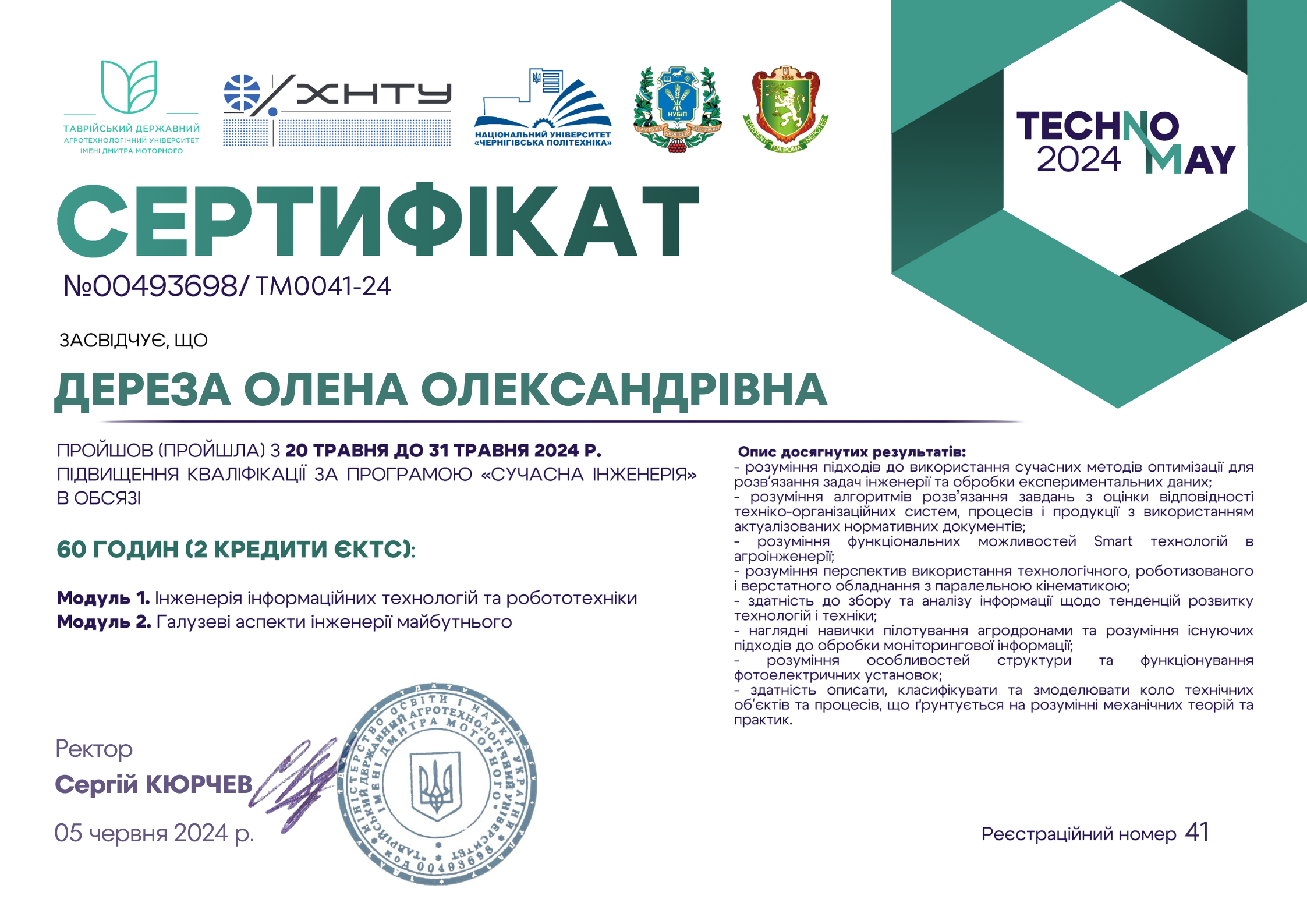 Таврійський державний агротехнологічний університет імені Дмитра Моторного (м. Запоріжжя, Україна), ХНТУ (м. Херсон, Україна), НУБіП (м. Київ, Україна), Львівський національний університет природокористування (м. Львів, Україна), Національний університет «Чернігівська політехника» (м. Чернігів, Україна). Сертифікат про підвищення кваліфікації №00493698/TM0041-24 від 05.06.2024 р. Тема: «Сучасна інженерія», обсягом 60 годин (2 кредити ЄКТС).