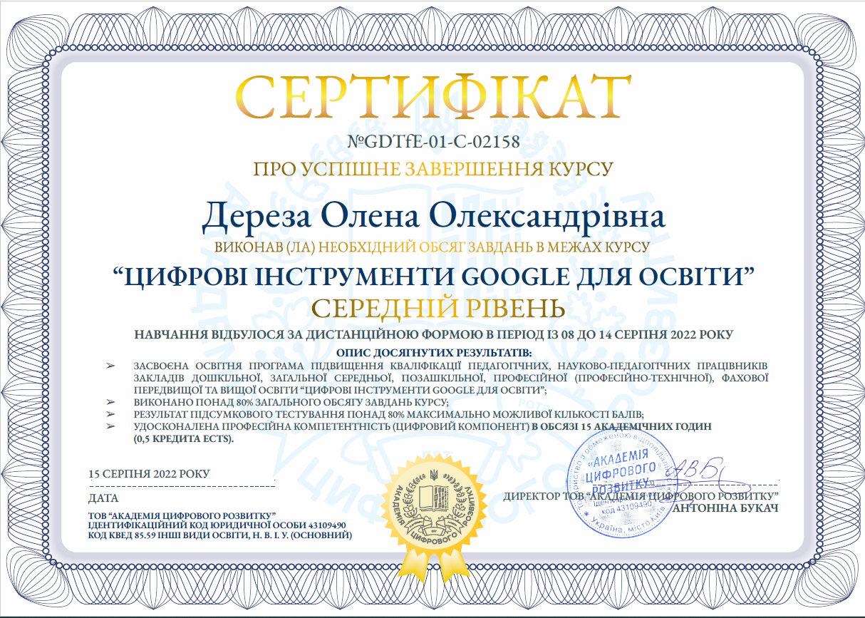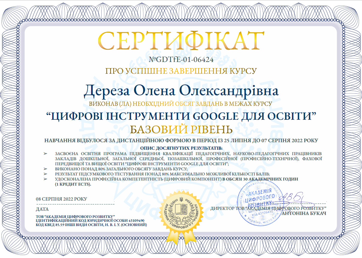 ТОВ “Академія цифрового розвитку” (м.Київ, Україна). Сертифікат №GDTef-01-06424 від 08.08.2022 р. Тема: “Цифрові інструменти Google для освіти (базовий рівень)”, обсяг – 30 годин (1 кредит ЄКТС)