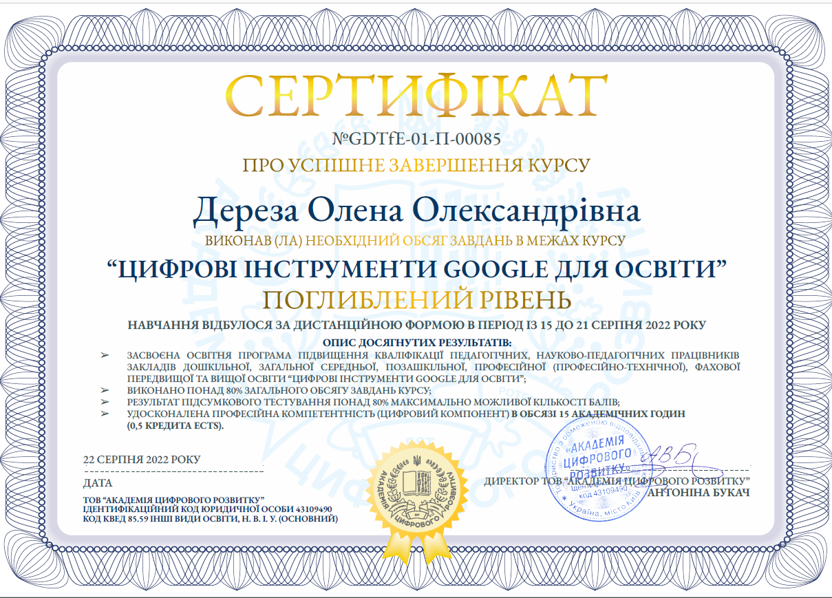 ТОВ “Академія цифрового розвитку” (м.Київ, Україна). Сертифікат №GDTef-01-П-00085 від 22.08.2022 р. Тема: “Цифрові інструменти Google для освіти (поглиблений рівень)”, обсяг – 15 годин (0,5 кредиту ЄКТС)