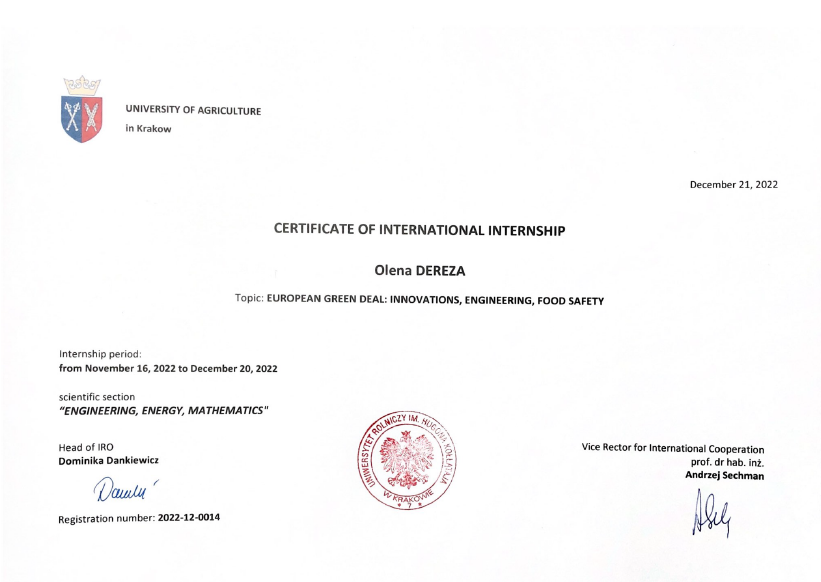 Міжнародне стажування. University of Agriculture in Krakow (Краков, Польща). Сертифікат про міжнародне стажування №2022-12-0014 від 21.12.2022 р. Тема: “European green deal: Innovations, engineering, food safety”, стажування з 16.11.2022 р. до 20.12.2022 р., (3 кредити ЄКТС)