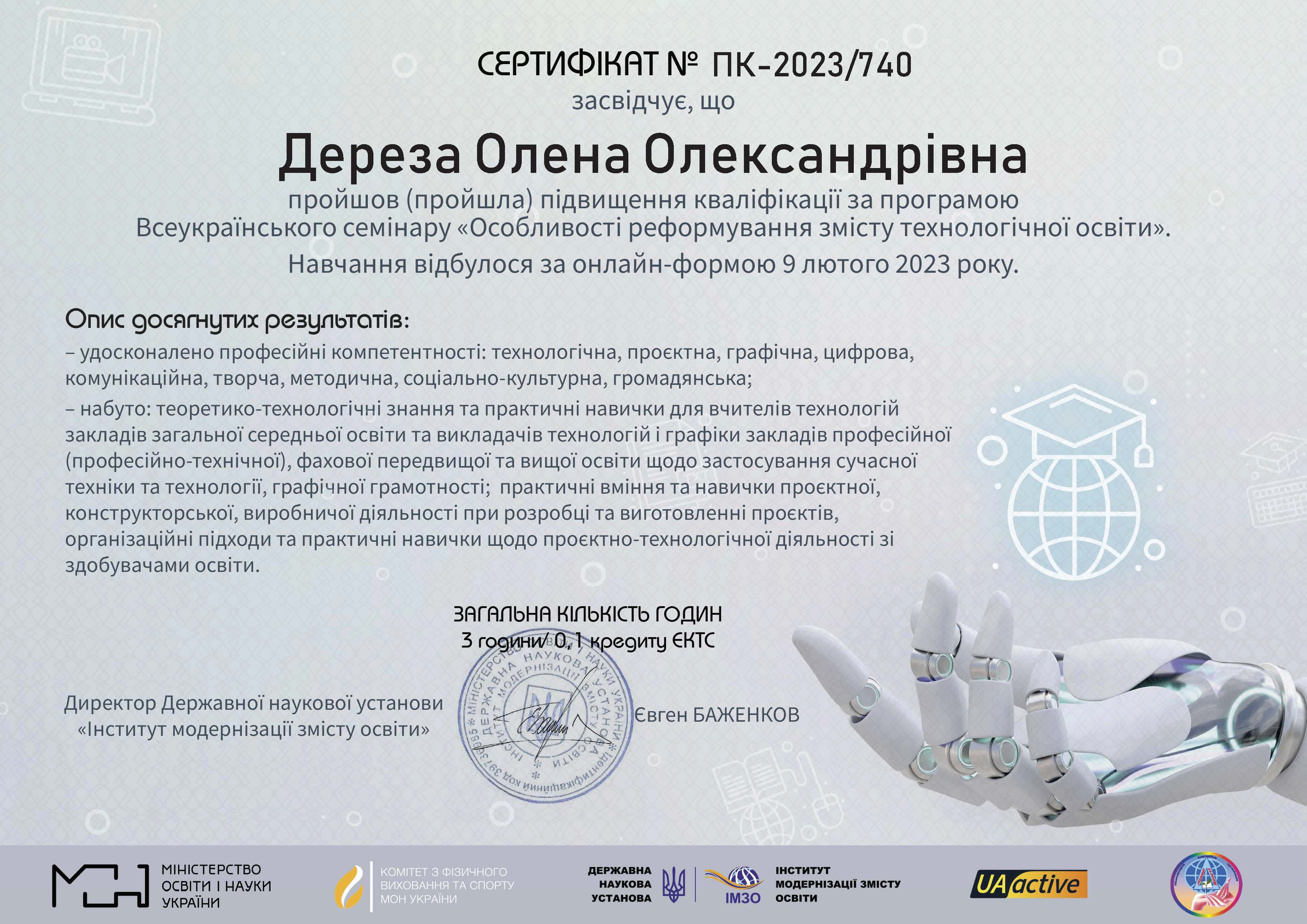 Державна наукова установа “Інститут модернізації змісту освіти”. Сертифікат про підвищення кваліфікації №ПК-2023/740 від 09.02.2023 р. Тема: “Особливості реформування змісту технологічної освіти”, обсяг – 3 години (0,1 кредити ЄКТС). Визнано підвищенням кваліфікації (наказ №449-ІПК від 28.12.2023 р.)