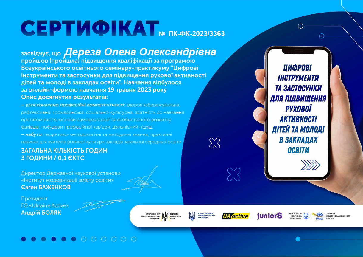 Державна наукова установа “Інститут модернізації змісту освіти”. Сертифікат про підвищення кваліфікації №ПК-ФК-2023/3363 від 19.05.2023 р. Тема: “Цифрові інструменти та застосунки для підвищення рухової активності дітей та молоді в закладах освіти”, обсяг – 3 години (0,1 кредити ЄКТС). Визнано підвищенням кваліфікації (наказ №449-ІПК від 28.12.2023 р.)