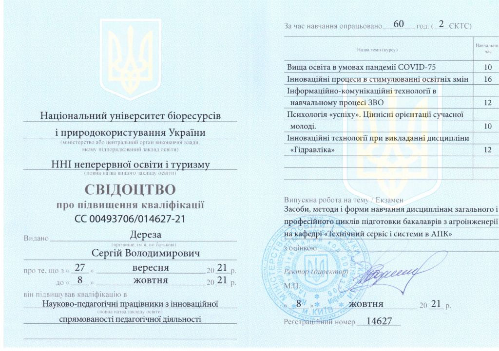 Національний університет біоресурсів і природокористування України, ННІ неперервної освіти і туризму. Свідоцтво про підвищення кваліфікації СС 00493706/014627-21 №14627 від 08.10.21 р. Тема: «Науково-педагогічні працівники з інноваційної спрямованості педагогічної діяльності», 60 год. (2 кредити ЄКТС)