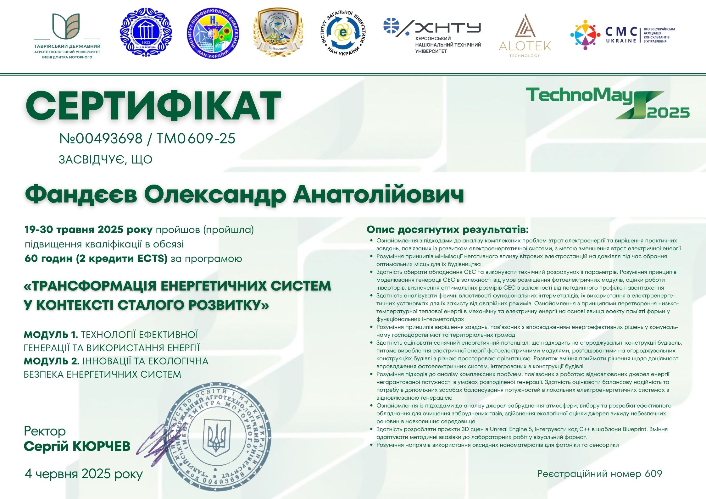 ТДАТУ (м. Запоріжжя, Україна), Інститут загальної енергетики НАН України (м. Київ, Україна), Інститут відновлюваної енергетики НАН України (м. Київ, Україна), ХНУМГ (м. Харків, Україна), ДБТУ (м. Харків, Україна), ХНТУ (м. Хмельницький , Україна) , ALOTEK (Польща), Всеукраїнська асоціація консультантів з управління CMC-Ukraine (м. Київ, Україна). Сертифікат №00493698 / ТМ0 609-25 від 04.06.2025 р. Тема: “Трансформація енергетичних систем у контексті сталого розвитку”, обсягом 60 годин (2 кредити ЄКТС).