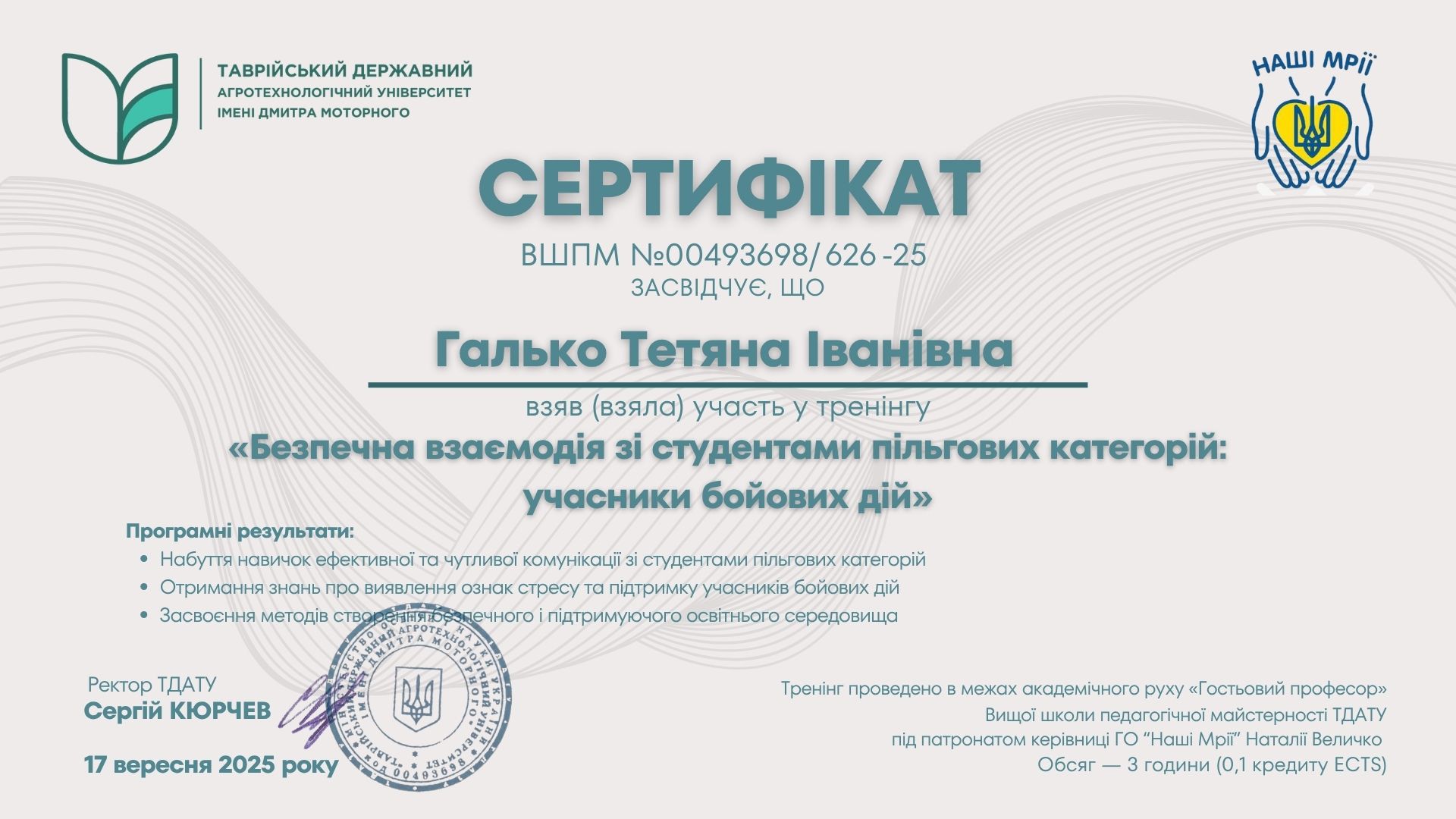 Галько Тетяна Іванівна Підвищення кваліфікації, стажування за останні 5 років 2025 рік ВШПМ. Таврійський державний агротехнологічний університет імені Дмитра Моторного (м. Запоріжжя, Україна), ГО “Наші Мрії” (м.Запоріжжя, Україна). Сертифікат про підвищення кваліфікації ВШПМ №00493698/0626-25 від 17.09.2025 р. Тема: “Безпечна взаємодія зі студентами пільгових категорій: учасники бойових дій”, обсягом 3 години (0,1 кредиту ЄКТС). Таврійський державний агротехнологічний університет ім. Дмитра Моторного (м.Запоріжжя, Україна). Сертифікат про підвищення кваліфікації №00493698/ТО0689-25 від 23.10.2025 р. Тема: “Сучасні технології та педагогічні практики”, обсягом 30 годин (1 кредит ЄКТС). Підвищення кваліфікації у попередні періоди —