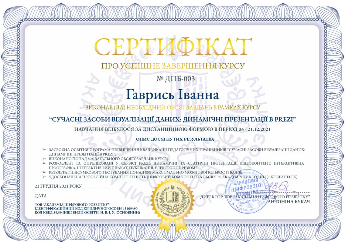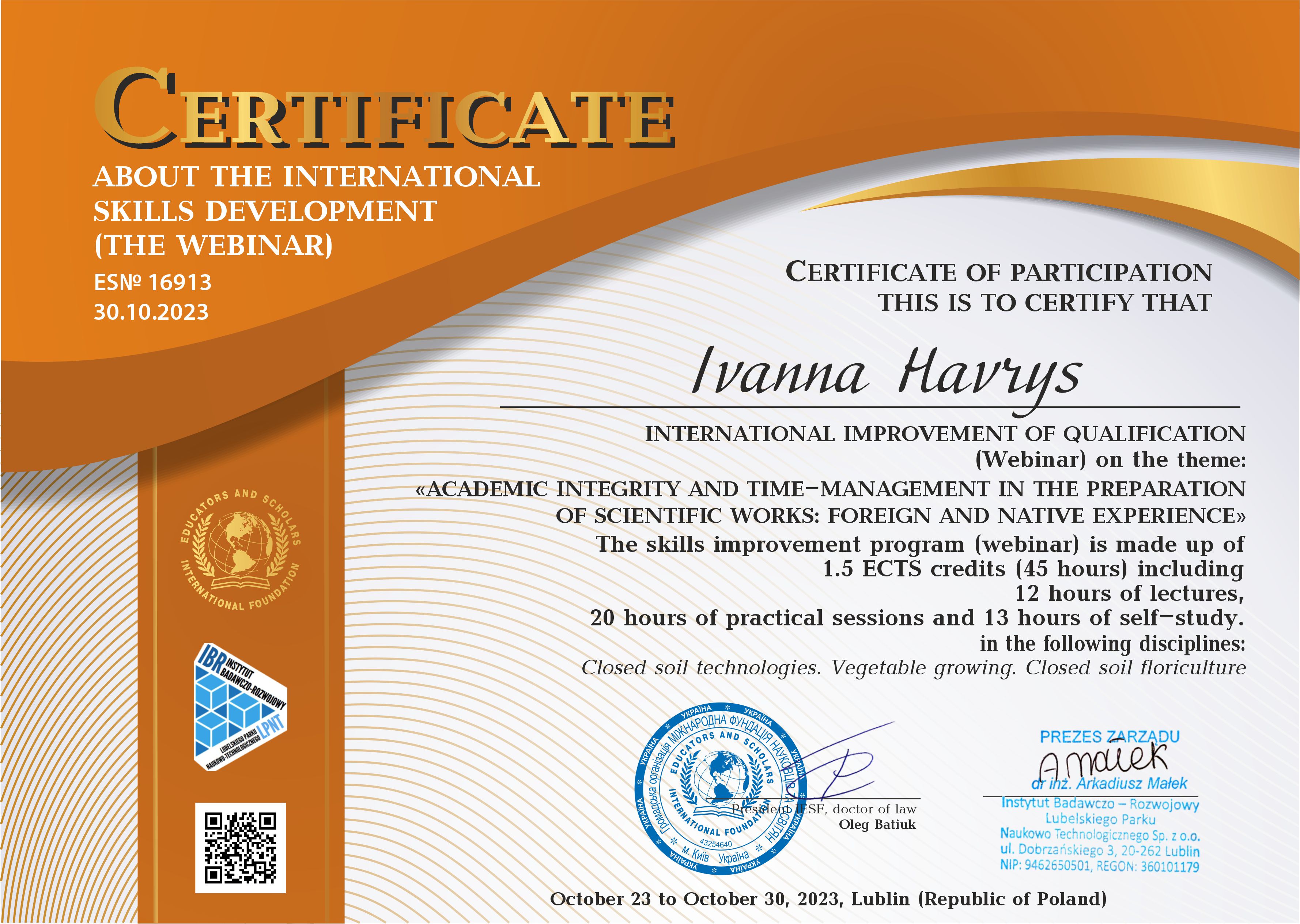 ГО “МФНО” (IESF), Instytut Badawczo-Rozwojowy Lubelskiego Parku Naukowo-Technologicznego (м. Люблін, Республіка Польща). Сертифікат про участь у вебінарі ES № 16913 від 30.10.2023 р. Тема “Академічна доброчесність та тайм-менеджмент при підготовці наукових робіт: зарубіжний та вітчизняний досвід”, обсягом 45 годин (1,5 кредиту ЄКТС). Визнано підвищенням кваліфікації (наказ №449-ІПК від 28.12.2023 р.)