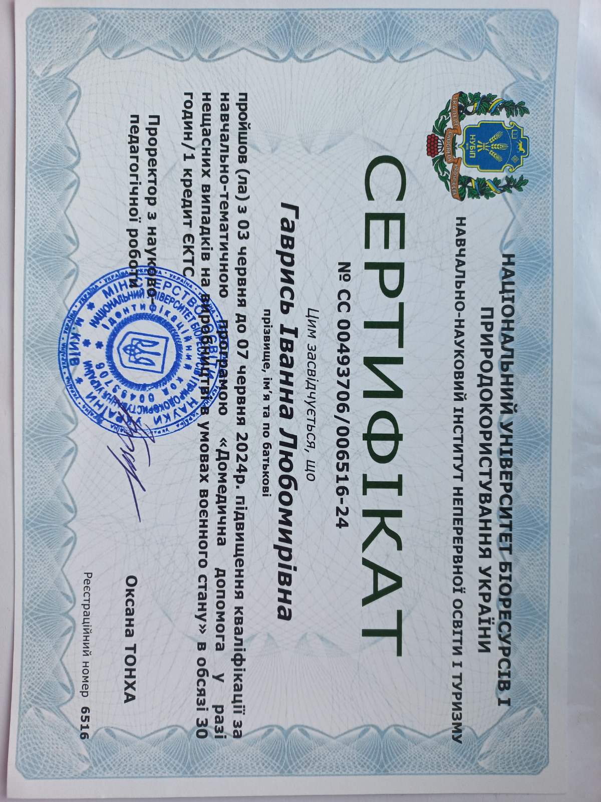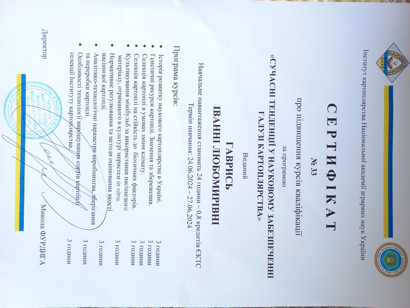 Інститут овочівництва і баштанництва НААН (с.Селекційне, Україна). Сертифікат про підвищення кваліфікації СПК №00497124/152/БО-21/2024 від 16.08.2024 р. Тема: «Біологізація галузі овочівництва, науково-практичні аспекти», обсягом 180 годин (6 кредитів ЄКТС). Визнано підвищенням кваліфікації (наказ ректора ТДАТУ № 481-ІПК від 27.12.2024 р.)
