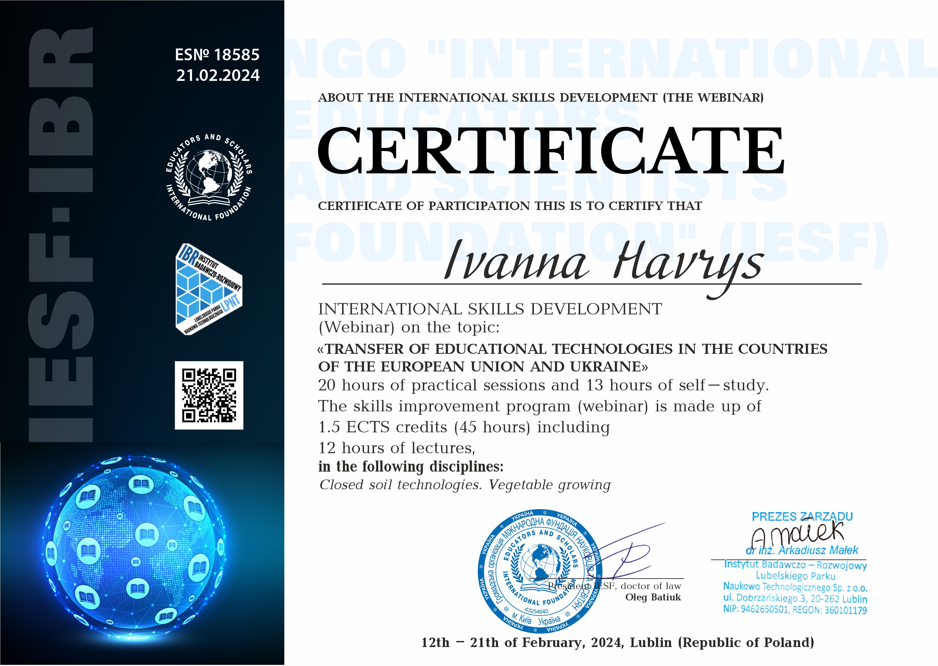 ГО “МФНО” (IESF), Instytut Badawczo-Rozwojowy Lubelskiego Parku Naukowo-Technologicznego (м. Люблін, Республіка Польща). Сертифікат про участь у вебінарі EP№ 16400 від 09.10.2023 р. Тема: “Неформальна освіта в підготовці магістрів та здобувачів доктора філософії (PhD) в країнах Європейського союзу та України”, обсягом 45 годин (1,5 кредиту ЄКТС). Визнано підвищенням кваліфікації (наказ №449-ІПК від 28.12.2023 р.)