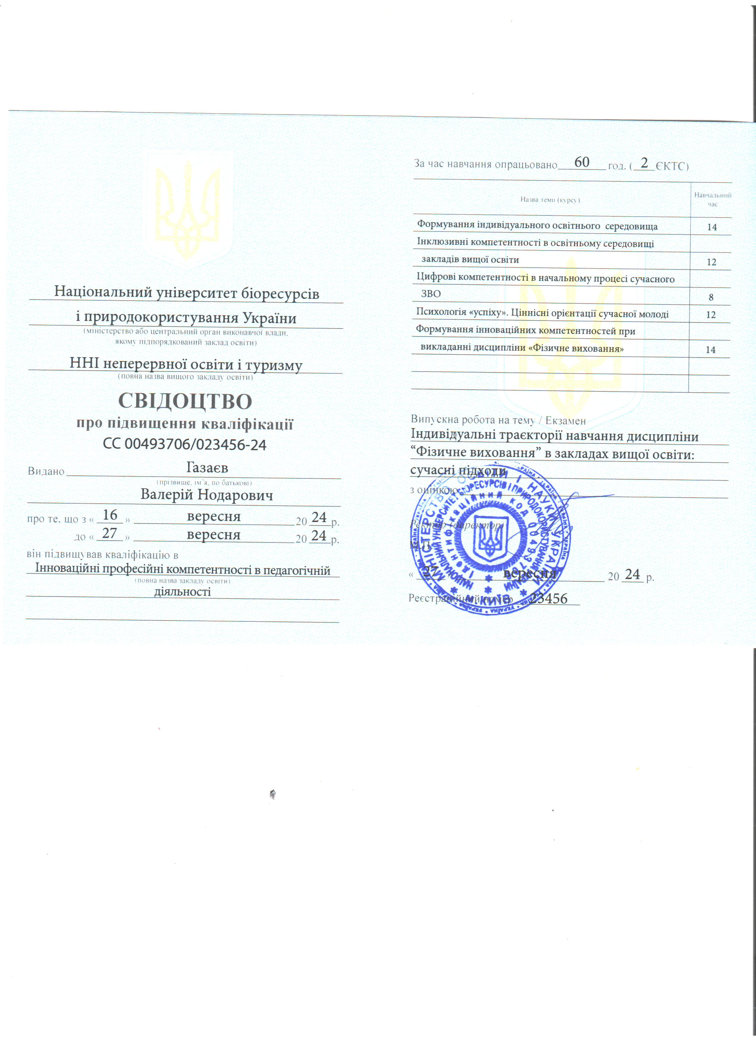 Національний університет біоресурсів і природокористування України, ННІ неперервної освіти і туризму (м.Київ, Україна). Свідоцтво про підвищення кваліфікації СС 00493706/023456-24 №23456 від 27.09.2024 р. Тема: «Інноваційні професійні компетентності в педагогічній діяльності», обсягом 60 годин (2 кредити ЄКТС).