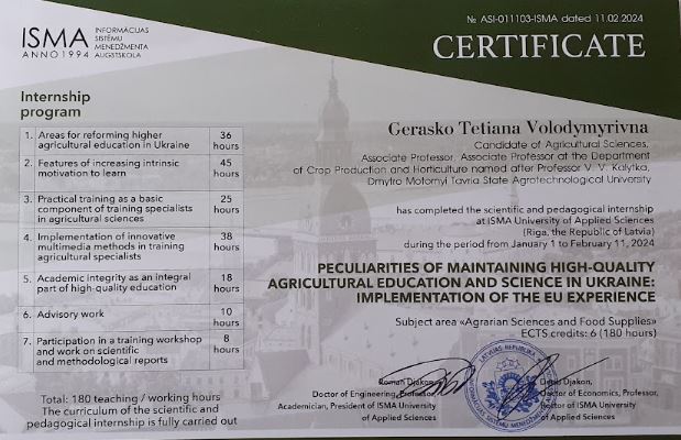 Міжнародне стажування. Informācijas sistēmu menedžmenta augstskola (ISMA) (Riga, Латвія). Сертифікат про міжнародне стажування № ASI-011103-ISMA від 11.02.2024 р. Тема: «Особливості підтримання високої якісності аграрної освіти та науки в Україні: впровадження досвіду ЄС», обсягом 180 годин (6 кредитів ЄКТС). Визнано підвищенням кваліфікації (наказ ректора ТДАТУ №104-ІПК від 31.05.2024 р.)