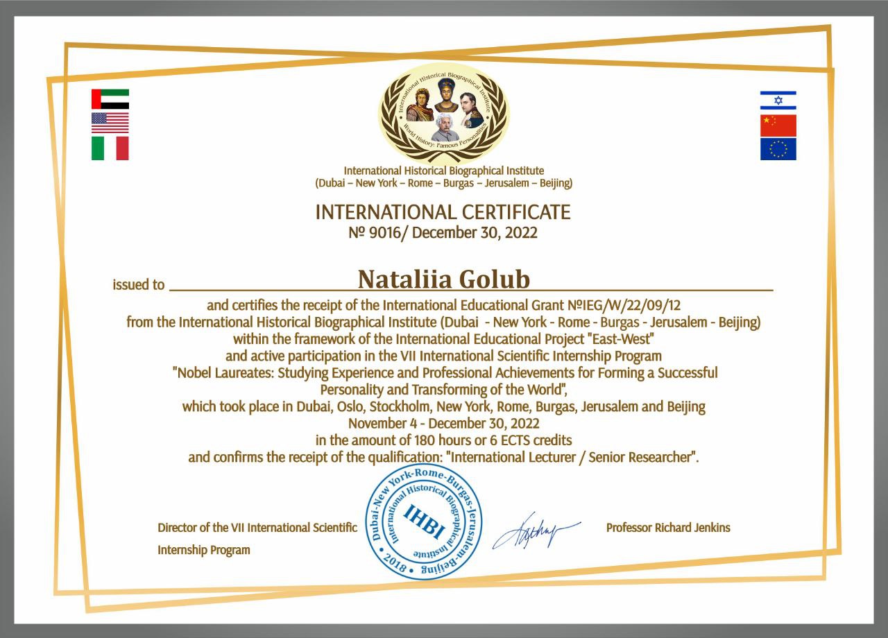 Міжнародна програма. Університет Миколаса Ромеріса (м. Вільнюс, Литва). Сертифікат про завершення міжнародного онлайн-тренінгу №TRAIN-2025-042 від 18.07.2025 р. Тема: “Мислення, засноване на ШІ, у підприємницьких сферах” (в межах проєкту EIT HEI-TRAIN: Трансформація ВНЗ для підприємництва та інновацій на основі ШІ), обсягом 180 годин (6 кредитів ЄКТС). Визнано підвищенням кваліфікації (наказ ректора ТДАТУ №355-ІПК від 06.10.2025 р.)