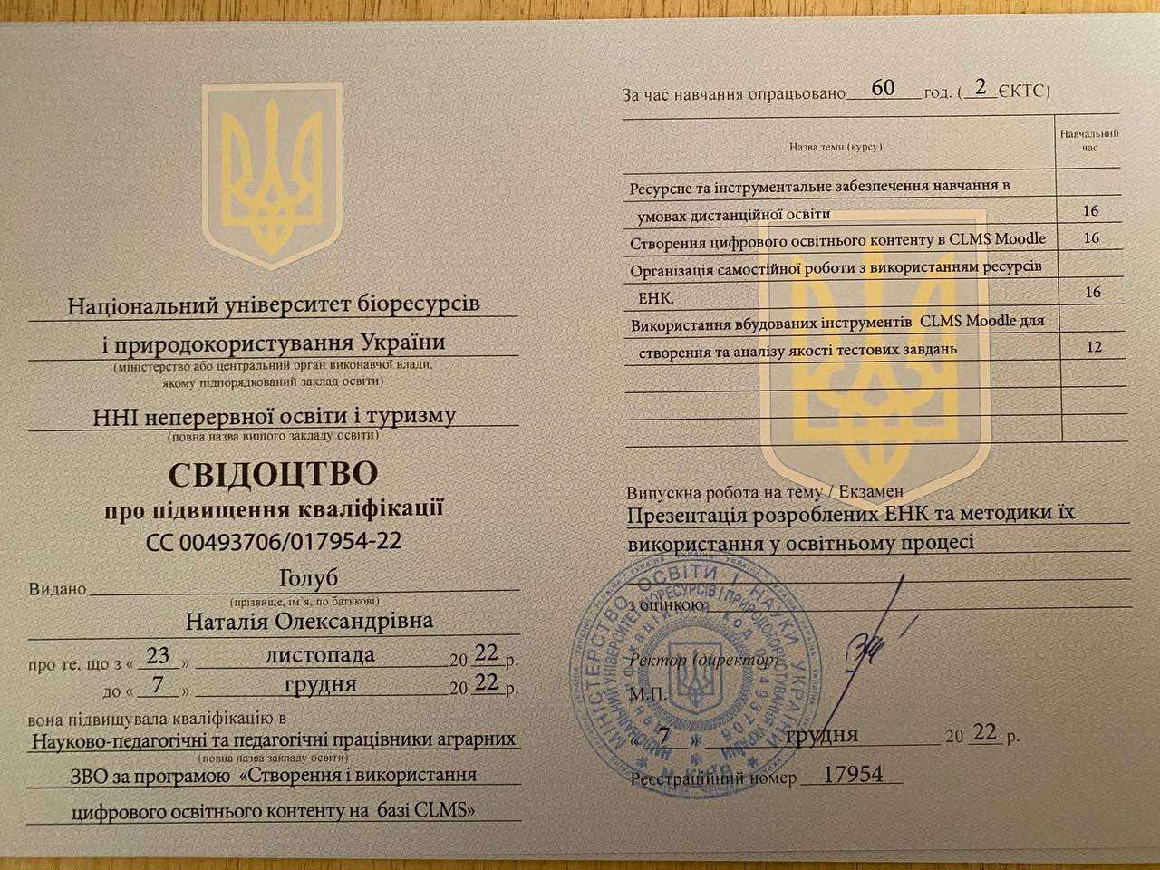 2017 рік. Національний університет біоресурсів і природокористування України ННІ післядипломної освіти, 2017, СС 00493706/002269-17 «Інноваційна спрямованість педагогічної діяльності»