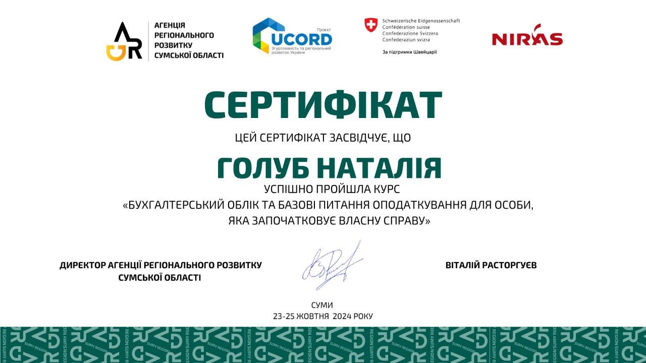 Агенція регіонального розвитку Сумської області (м. Суми, Україна). Сертифікат про проходження курсу, виданий 25.10.2024 р. Тема: «Бухгалтерський облік та базові питання оподаткування для особи, яка започатковує власну справу», обсягом 6 годин (0,2 кредиту ЄКТС). Визнано підвищенням кваліфікації (наказ ректора ТДАТУ №79-ІПК від 07.04.2025 р.)