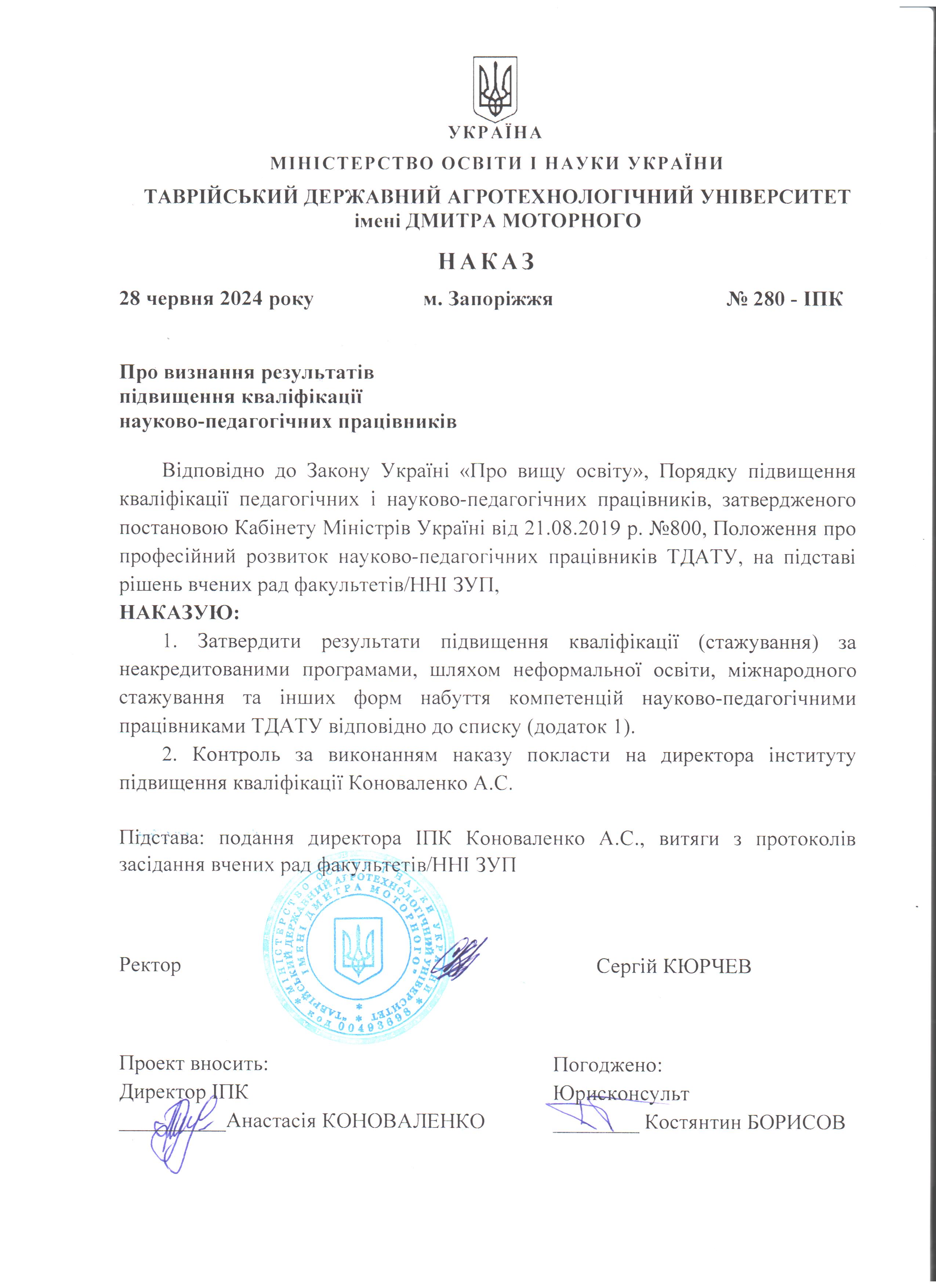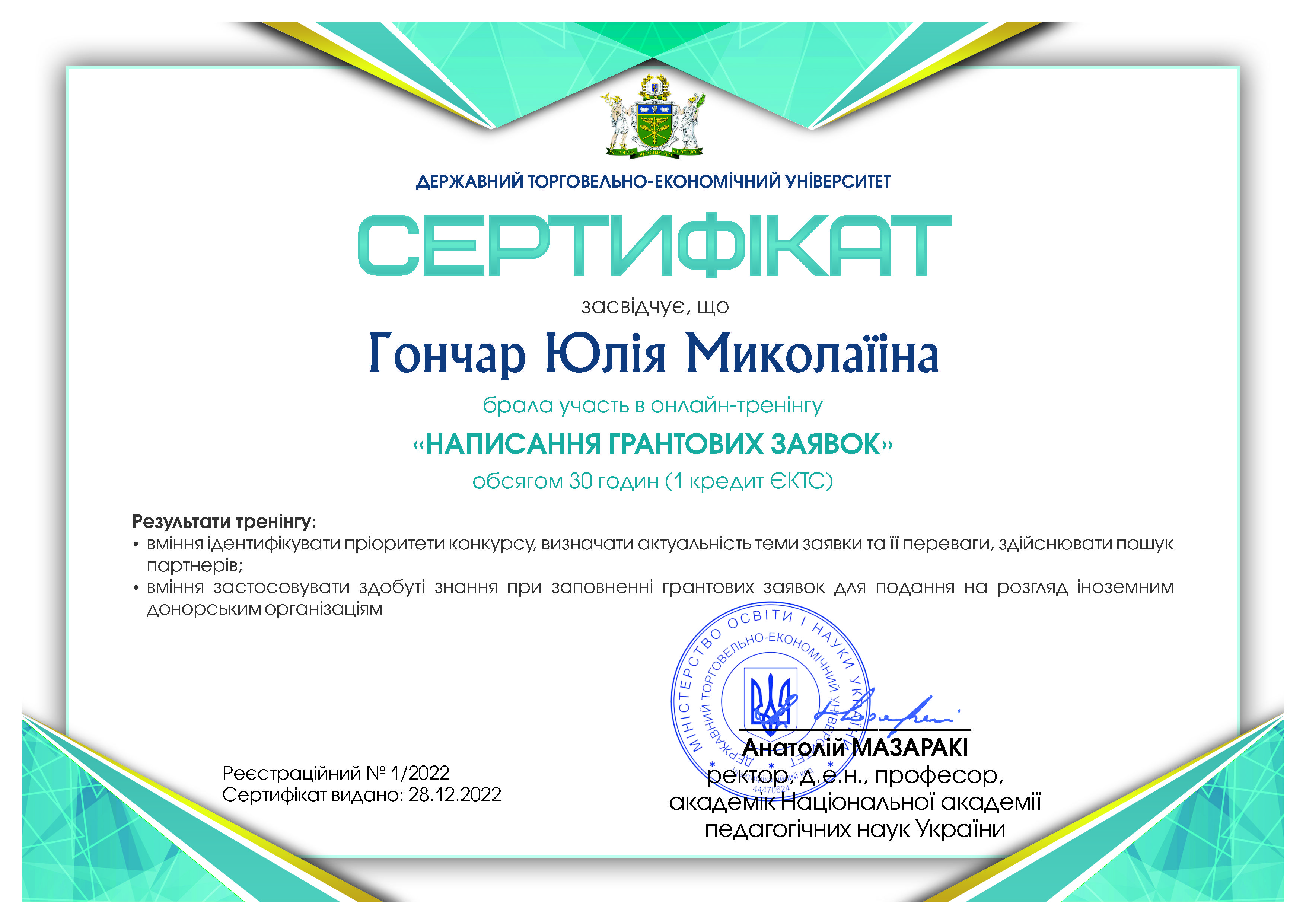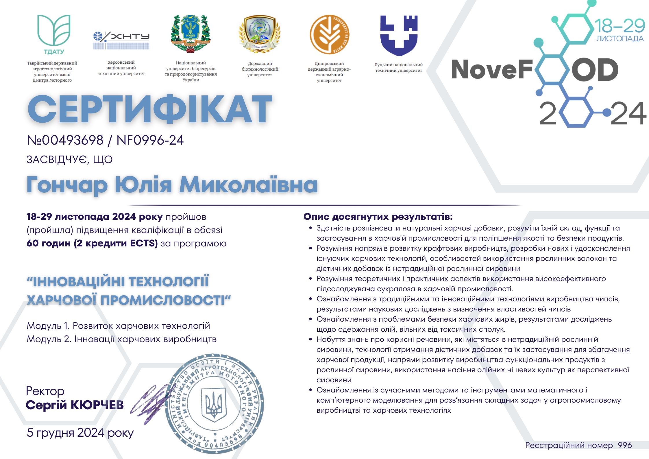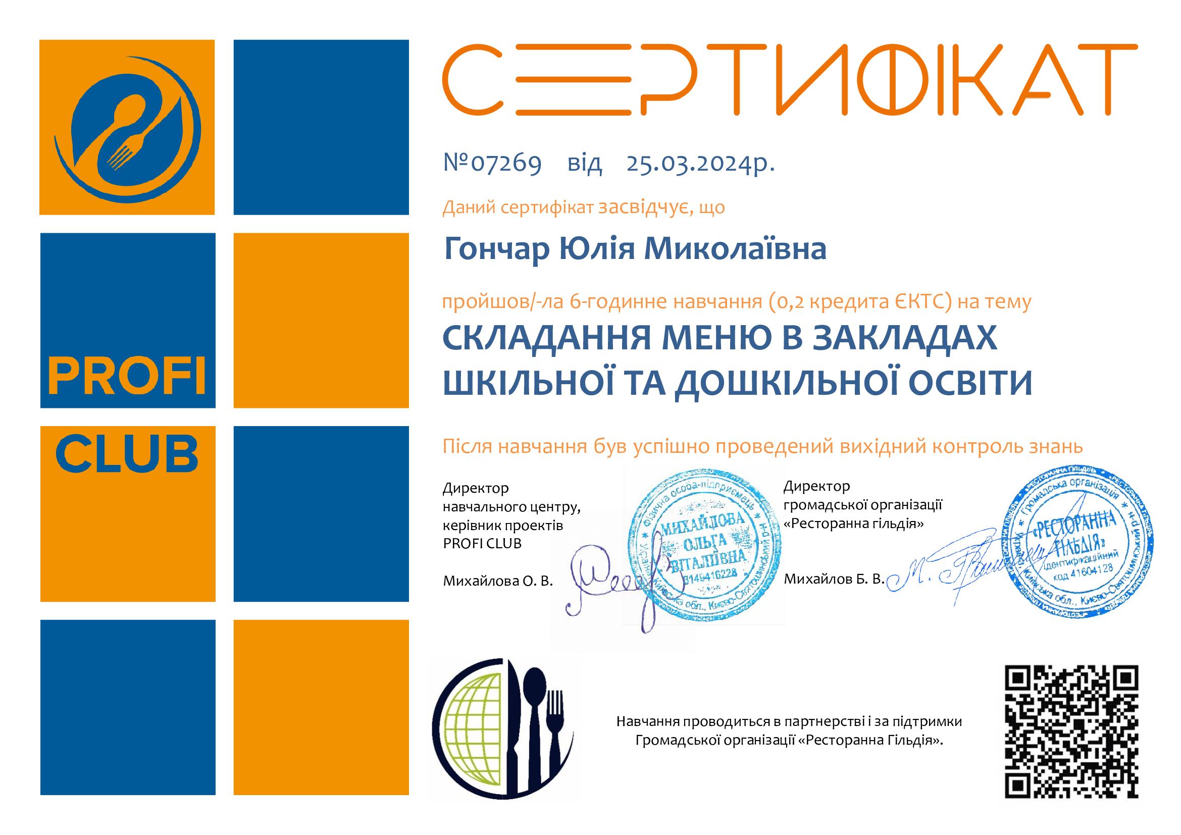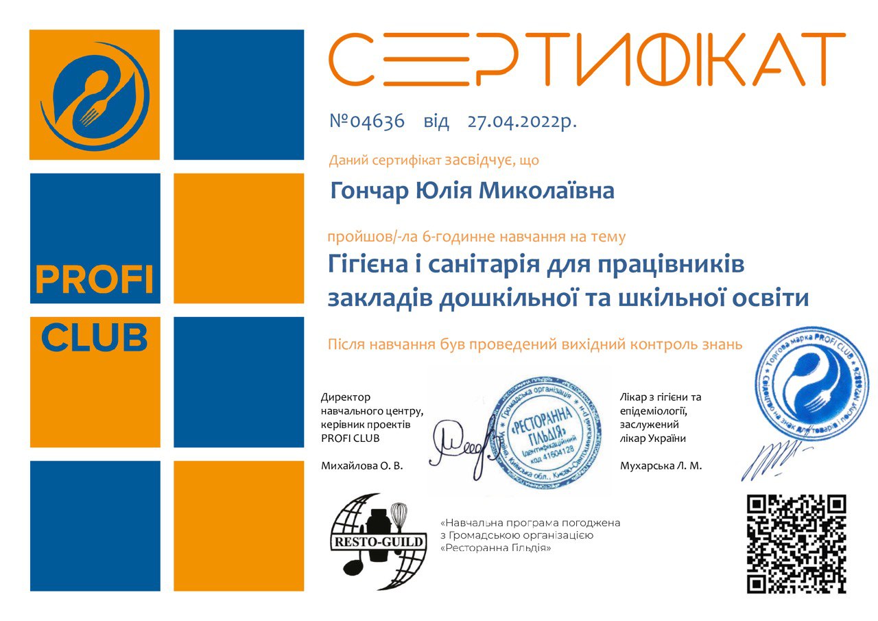 ГО «Ресторанна гільдія» (Києво-Святошинський р-н, Україна), Асоціація рестораторів та готельєрів. Сертифікат про завершення навчання № 07269 від 25.03.2024 р. Тема: «Складання меню в закладах шкільної та дошкільної освіти», обсягом 6 годин (0,2 кредиту ЄКТС). Визнано підвищенням кваліфікації (наказ №280-ІПК від 28.06.2024 р.)