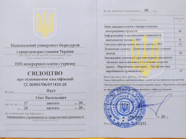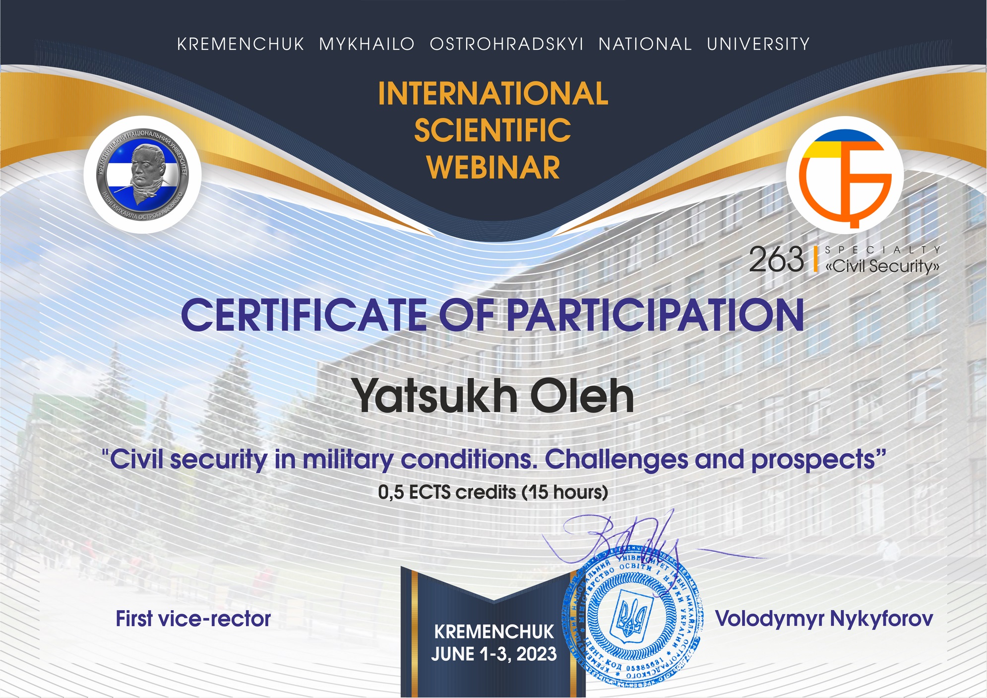 Кременчуцький національний університет імені Михайла Остроградського (м. Кременчук, Україна). Сертифікат про проходження вебінару, виданий 03.06.2023 р. Тема: «Цивільна безпека у військових умовах. Виклики та перспективи», обсягом 15 годин (0,5 кредиту ЄКТС). Визнано підвищенням кваліфікації (наказ №382-ІПК від 24.09.2024 р.)