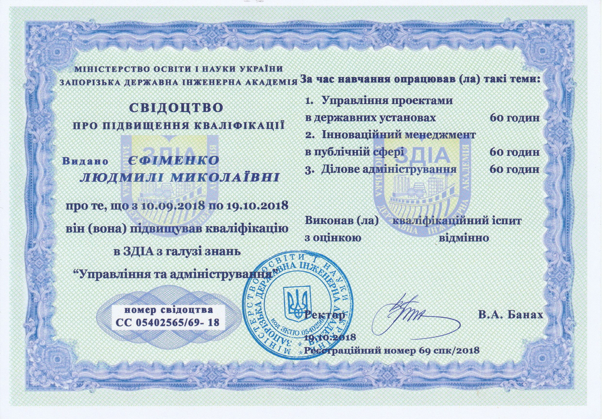 Міжнародне стажування.Instytut Spraw Administracji Publicznej (ISAP) (Lublin, Польща). Сертифікат про міжнародне стажування PL №025-05-24 від 10.05.2024 р. Тема: «Досвід державного управління та адміністрування ЄС», обсягом 180 годин (6 кредитів ЄКТС).Визнано підвищенням кваліфікації (наказ ректора ТДАТУ №104-ІПК від 31.05.2024 р.)