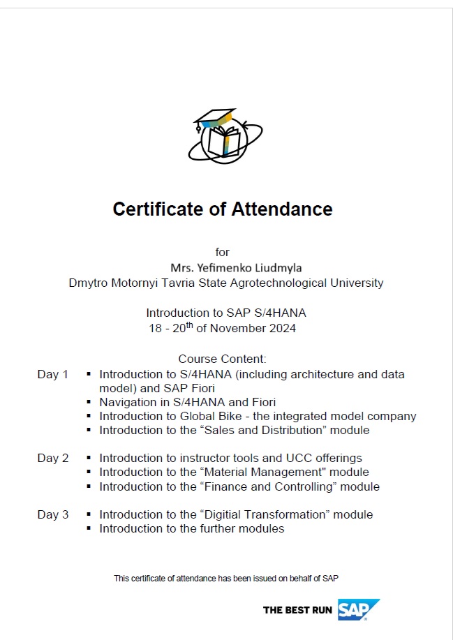 Best Run SAP Customer Experience. Сертифікат про проходження курсу, виданий 20.10.2024 р. Тема: “Вступ до SAP S/4HANA”, обсягом 0,6 кредиту ЄКТС.