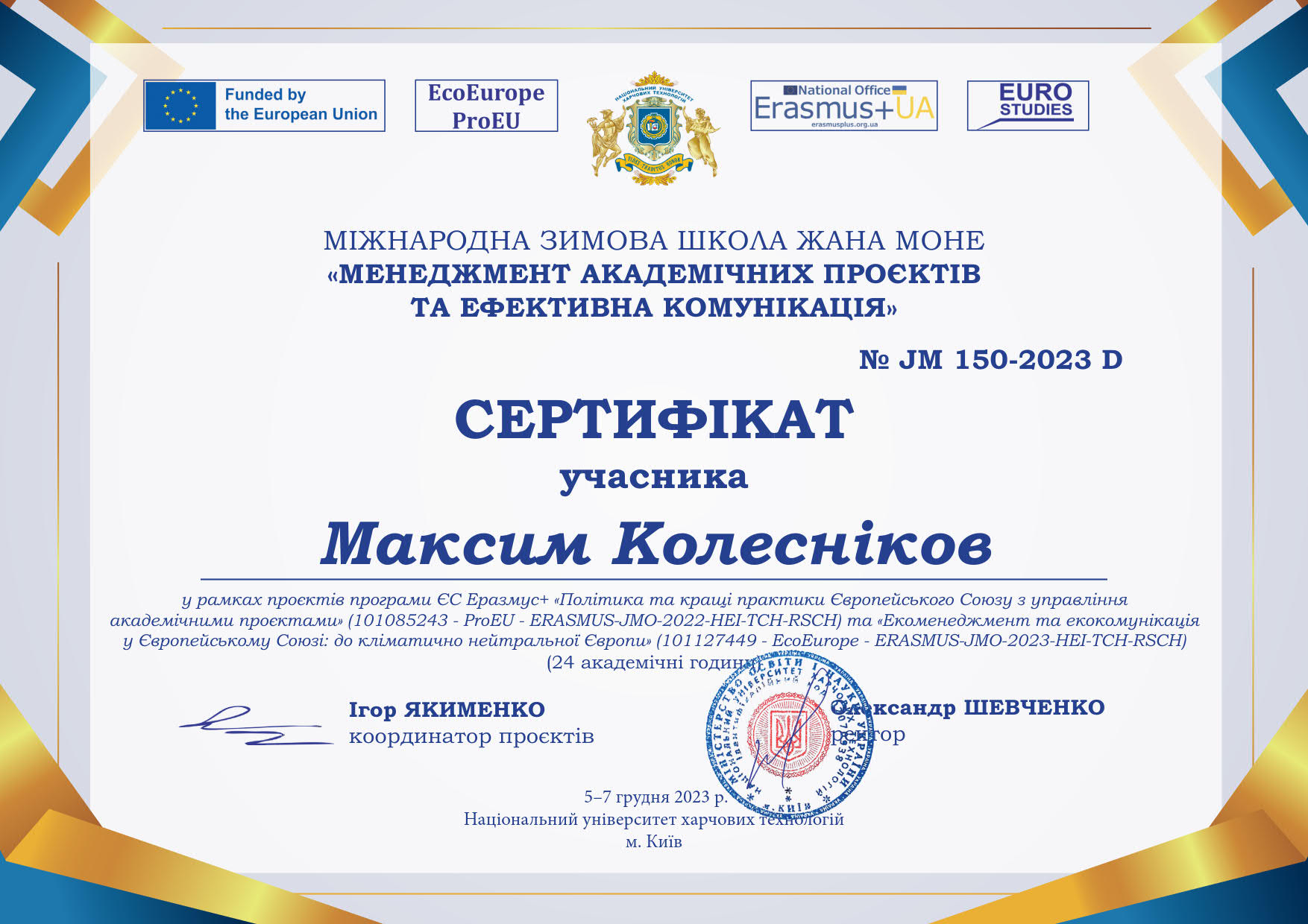 Національний університет харчових технологій (м.Київ, Україна). Сертифікат завершення зимової школи Жан-Моне № JM 150-2023 D від 07.12.2023 р. Тема «Менеджмент академічних проєктів та ефективна комунікація» (у рамках проєктів програми ЄС Еразмус+ “Політика та кращі практики Європейського Союзу з управління академічними проєктами), обсягом 24 години (0,8 кредиту ЄКТС). Визнано підвищенням кваліфікації (наказ ректора ТДАТУ №104-ІПК від 31.05.2024 р.)