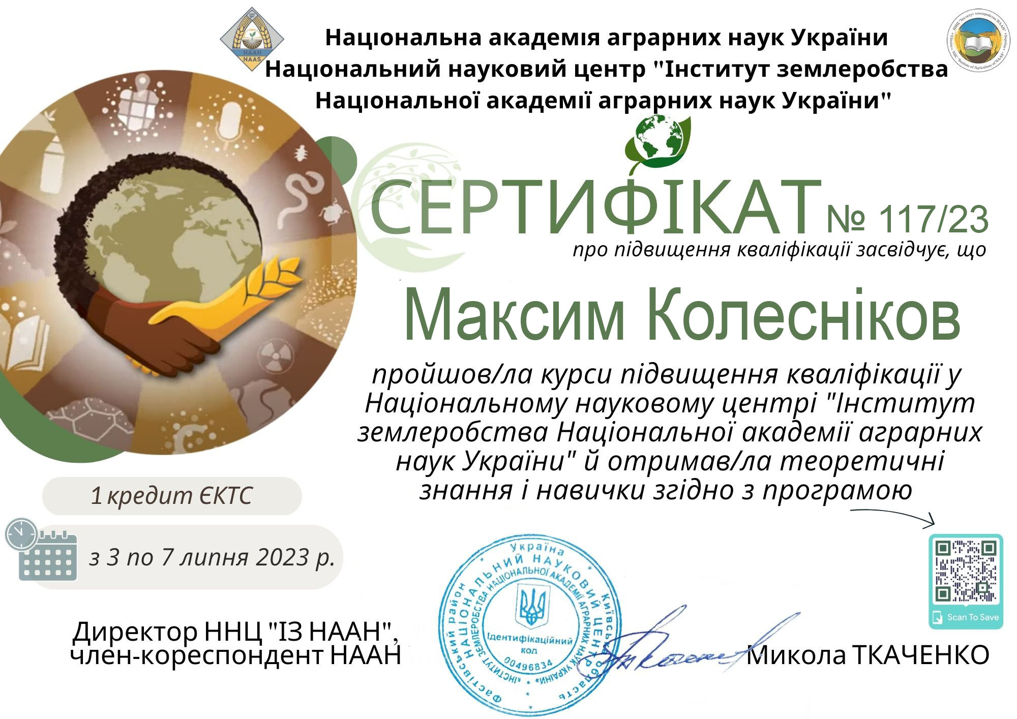 ННЦ «Інститут землеробства НААН України». (м.Київ, Україна). Сертифікат про підвищення кваліфікації за галузю знань № 117/23 від 07.07.2023 р., обсягом 30 годин (1 кредит ЕКТС)