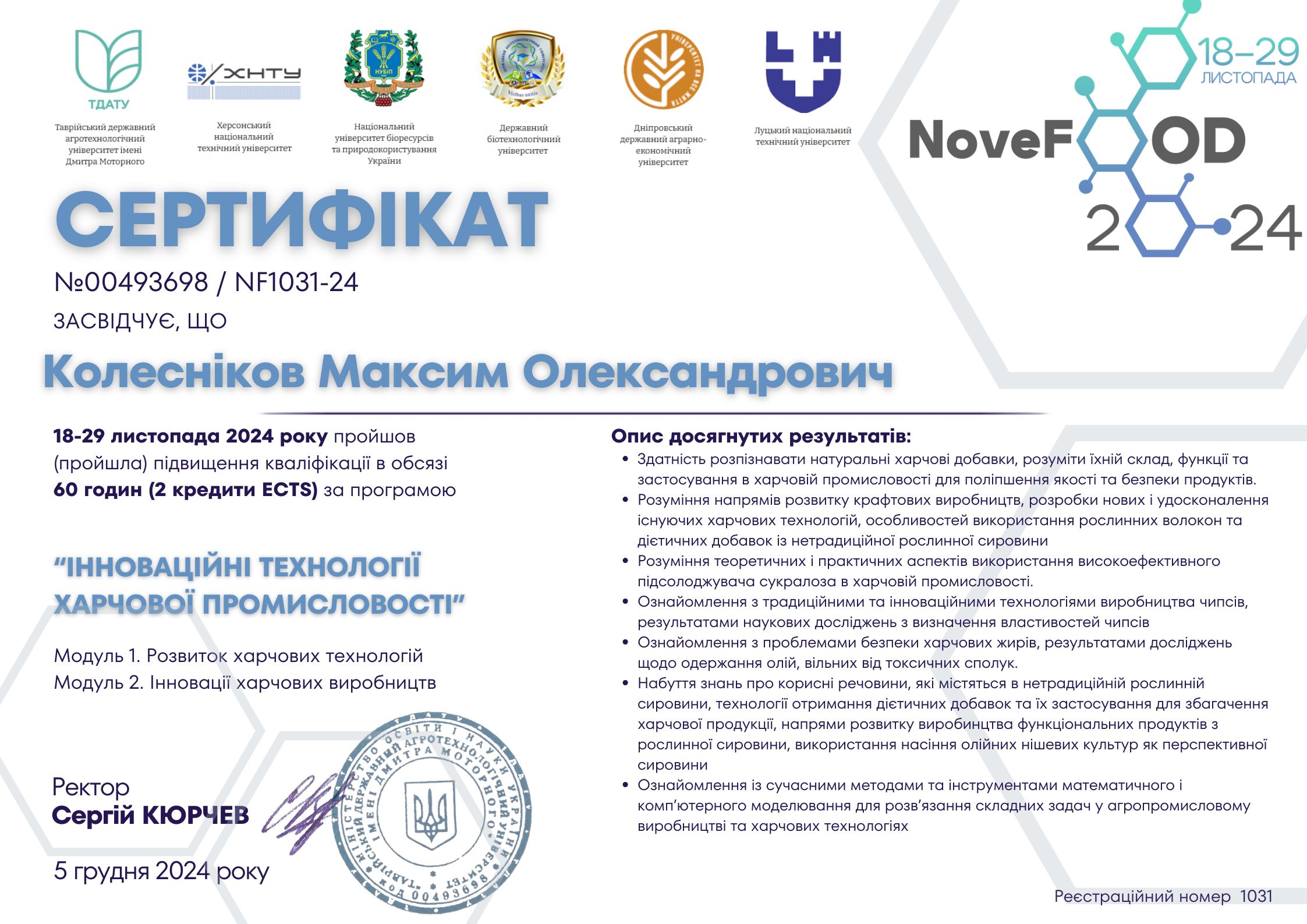 Таврійський державний агротехнологічний університет ім. Дмитра Моторного (м.Запоріжжя, Україна). Сертифікат про підвищення кваліфікації №00493698/ТО0730-25 від 23.10.2025 р. Тема: “Сучасні технології та педагогічні практики”, обсягом 30 годин (1 кредит ЄКТС).