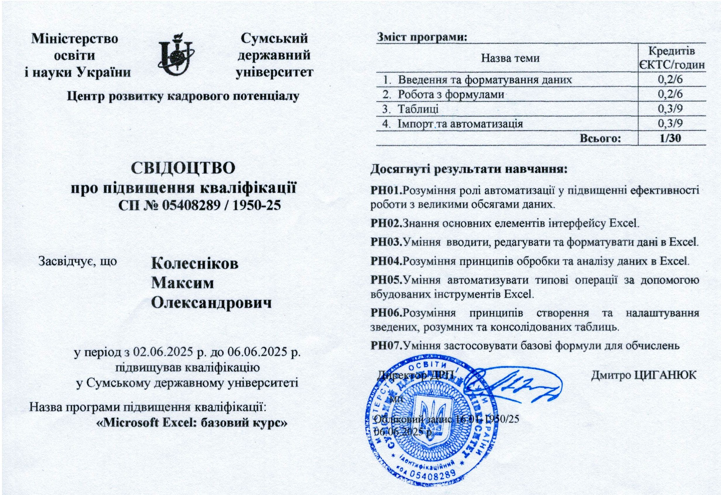 Сумський державний університет (м. Суми, Україна). Свідоцтво про підвищення кваліфікації СП №05408289/1950-25 від 06.06.2025 р. Тема: “Microsoft Excel: базовий курс”, обсягом 30 годин (1 кредит ЄКТС).