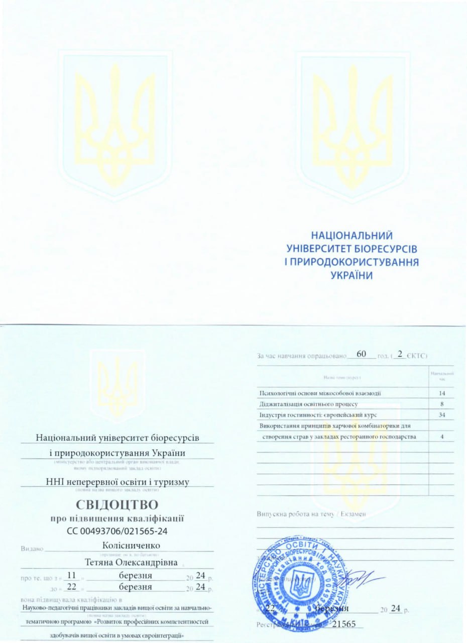 Національний університет біоресурсів і природокористування України, ННІ неперервної освіти і туризму. Свідоцтво про підвищення кваліфікації № СС 00493706/021565-24 від 22.03.2024 р. Тема: «Розвиток професійних компетентностей здобувачів вищої світи в умовах євроінтеграції», 60 годин (2 кредити ЄКТС).