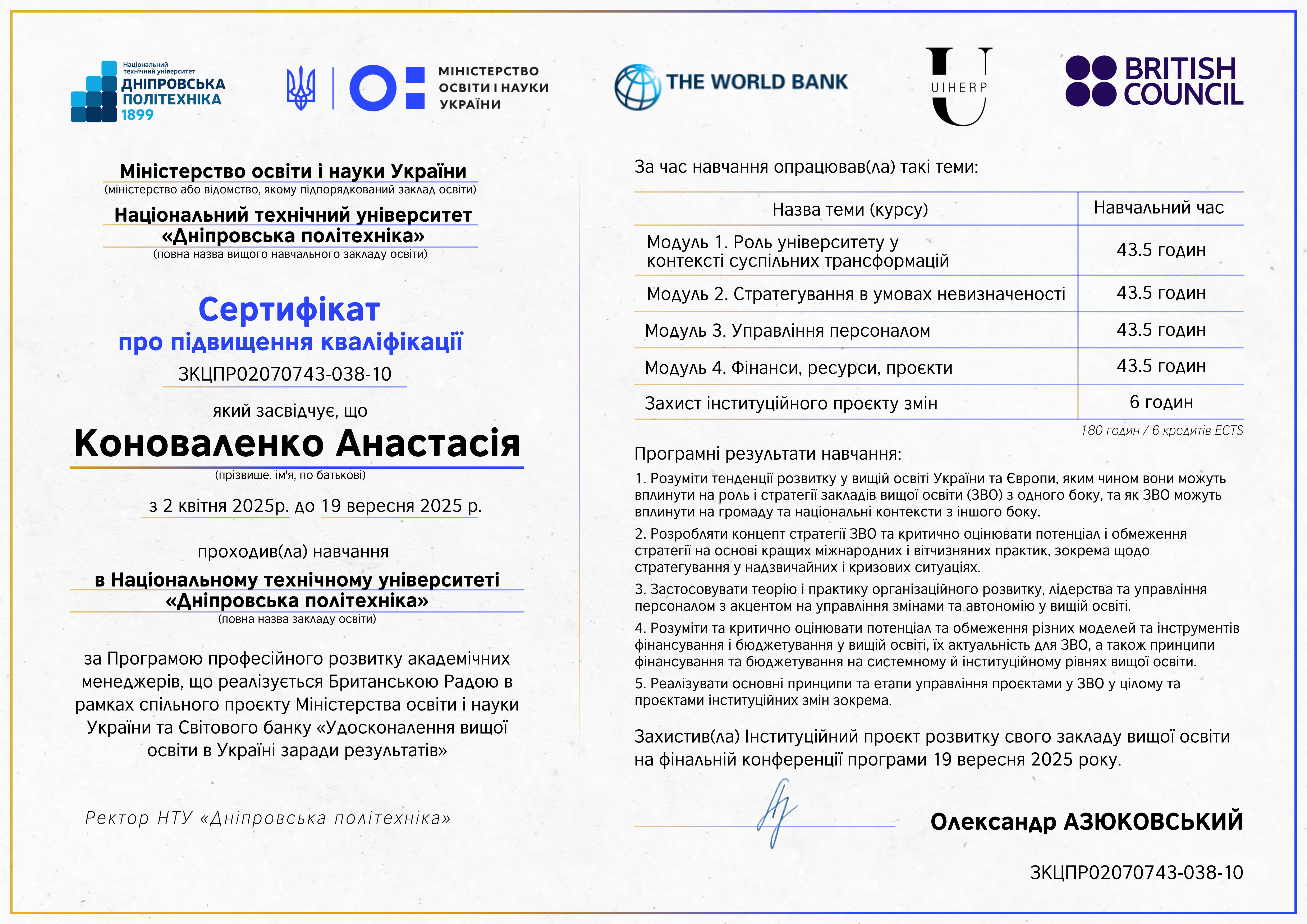 НТУ “Дніпровська політехніка”. Сертифікат про підвищення кваліфікації №ЗКЦПР02070743-038-10 від 19.09.2025 р. Тема: “Програма професійного розвитку академічних менеджерів” (реалізується Британською Радою в рамках спільного проєкту МОН України та Світового банку “Удосконалення вищої освіти в Україні заради результатів”), обсягом 180 годин (6 кредитів ЄКТС).
