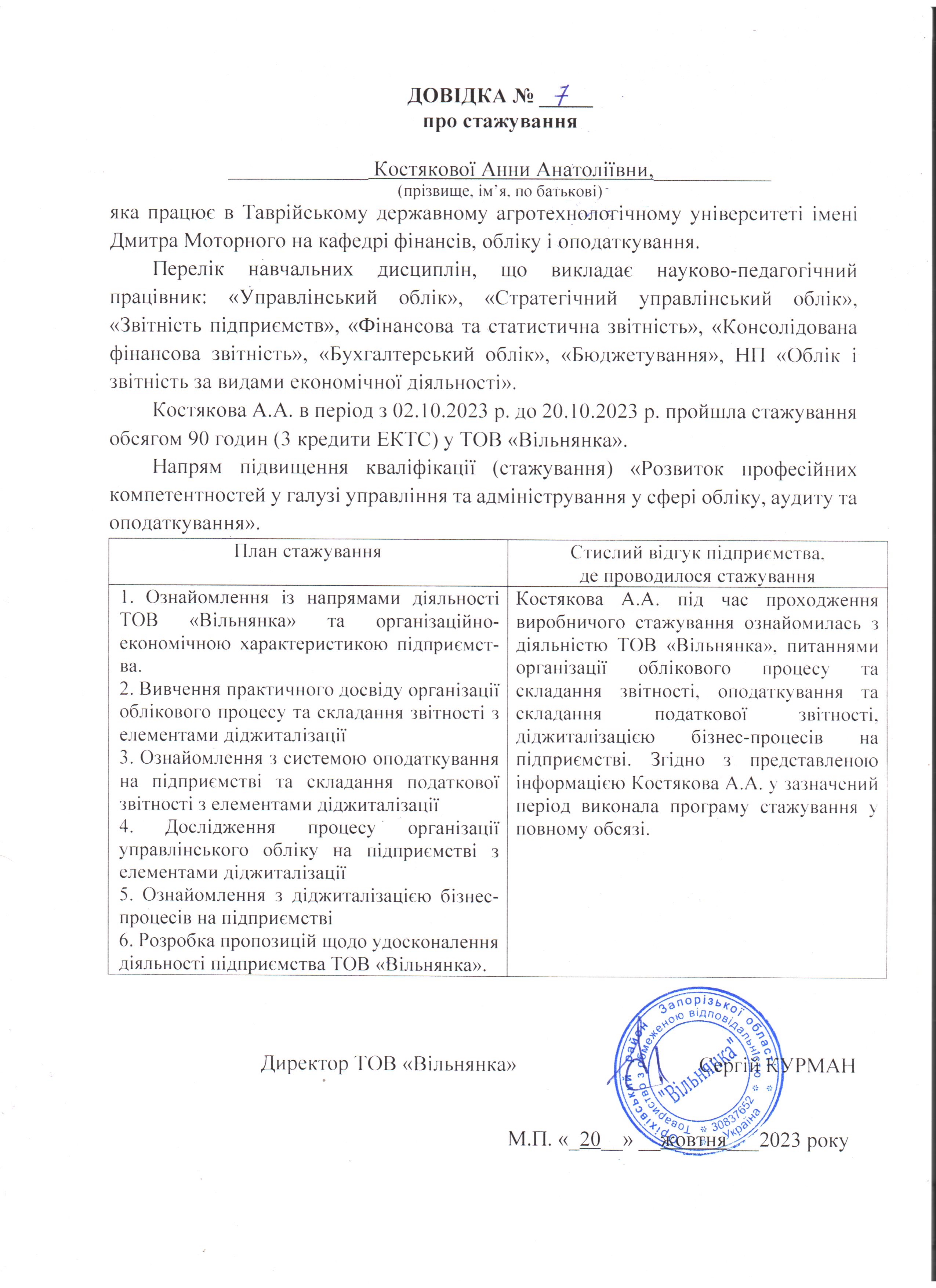 ГО “Федерація аудиторів, бухгалтерів і фінансистів АПК України”. Сертифікат №231130 від 03.11.2023 р. про завершення програми першого бухгалтерського воркшоп-стажування. Тема: “Облік діяльності бізнесу в умовах воєнного стану: новації-2023”, тривалість з 26.10.2023 р. до 03.11.2023 р., обсягом 45 годин (1,5 кредити ЄКТС). Визнано підвищенням кваліфікації (наказ №449-ІПК від 28.12.2023 р.)