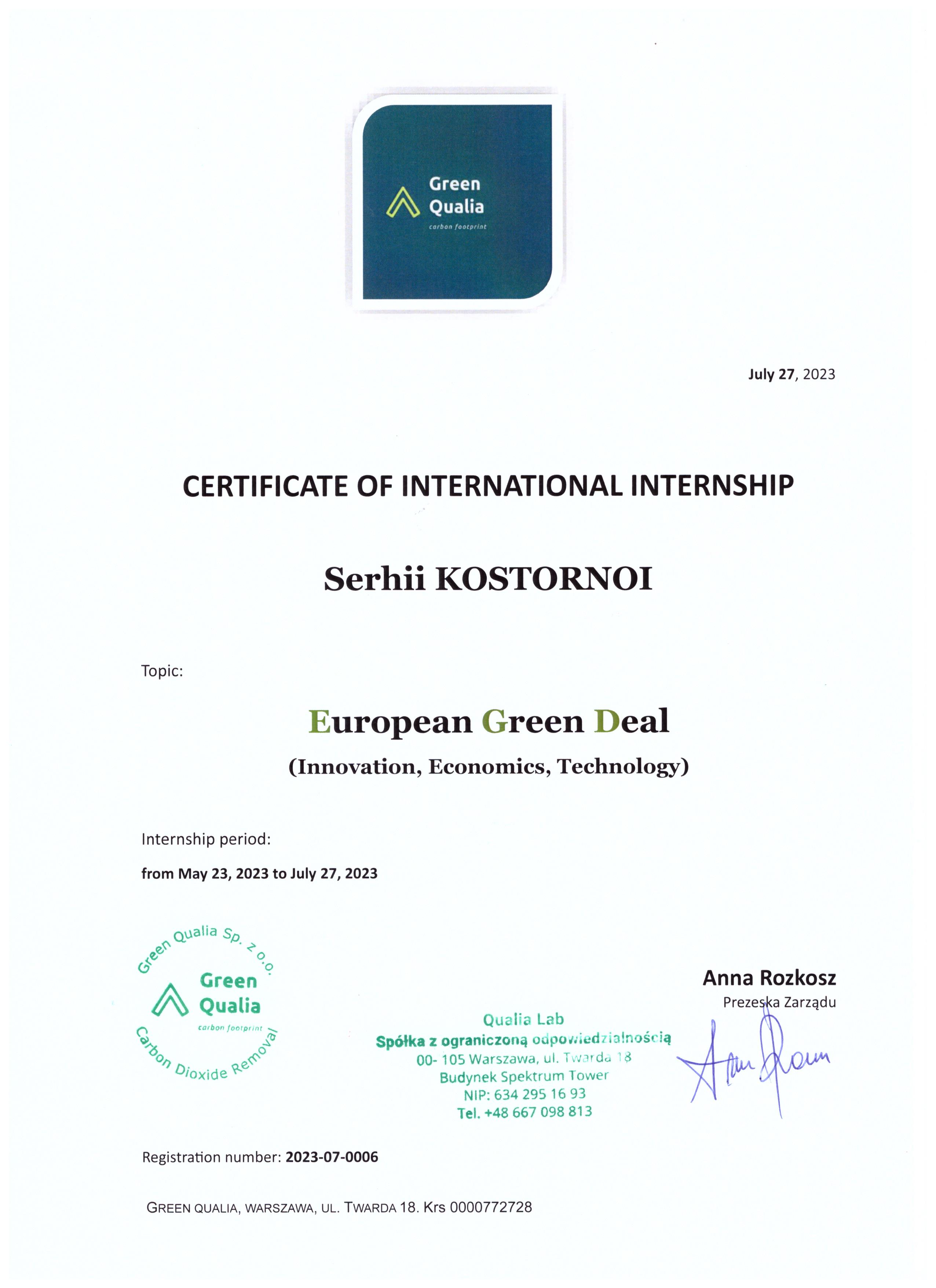 Міжнародне стажування. Сільськогосподарський університет імені Гуго Коллонтая (м. Краків, Польща). Сертифікат про міжнародне стажування № 2023-07-0006 від 27.07.2023 р. Тема: «Європейський зелений курс (Інновації, економіка, технології)», обсягом (1 кредит ЄКТС). Визнано підвищенням кваліфікації (наказ №280-ІПК від 28.06.2024 р.)