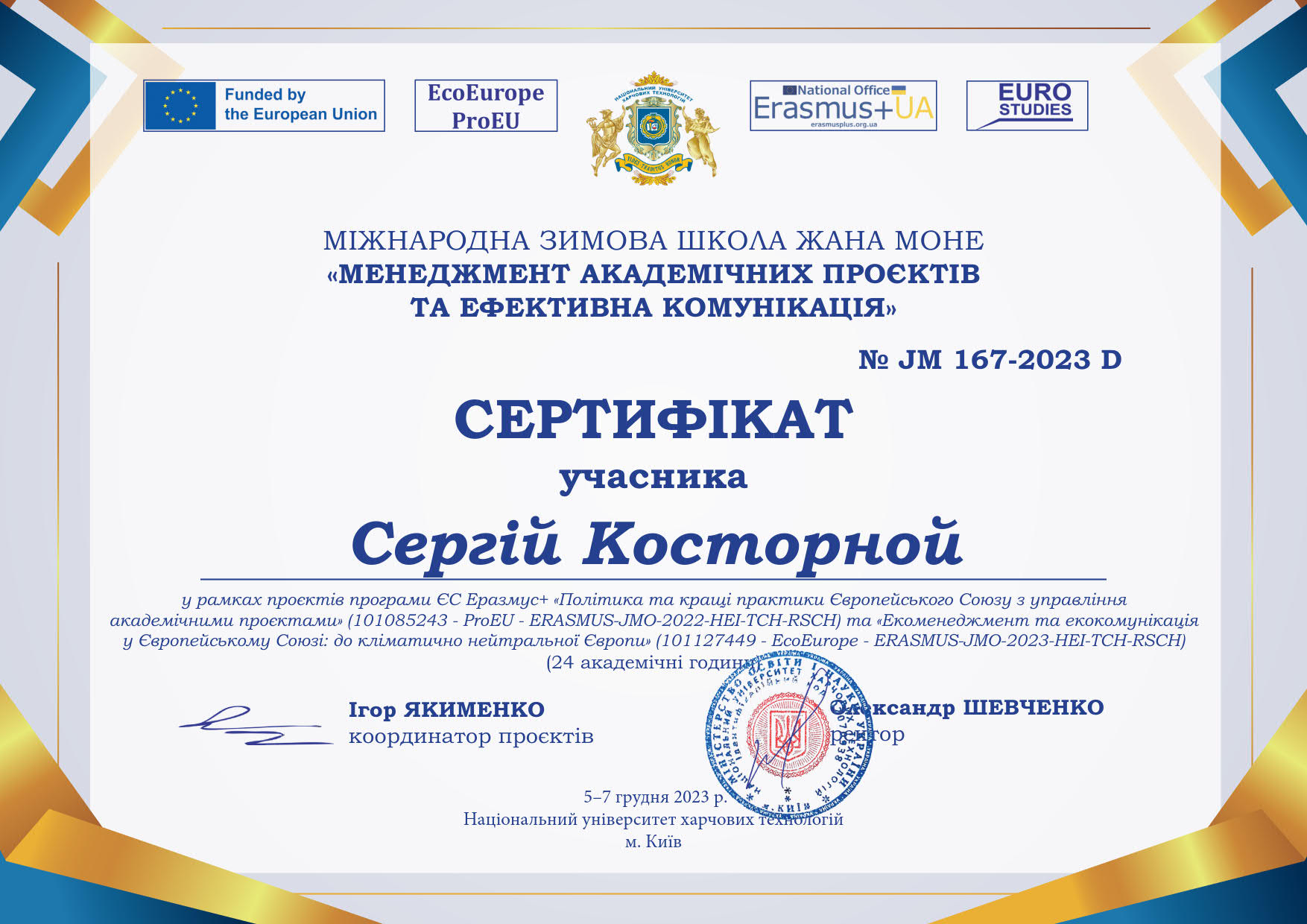 Національний університет харчових технологій (м. Київ, Україна). Сертифікат завершення зимової школи Жан-Моне № JM 167-2023 D від 07.12.2023 р. Тема «Менеджмент академічних проєктів та ефективна комунікація» (у рамках проєктів програми ЄС Еразмус+ «Політика та кращі практики Європейського Союзу з управління академічними проєктами»), обсягом 24 години (0,8 кредиту ЄКТС).Визнано підвищенням кваліфікації (наказ №280-ІПК від 28.06.2024 р.)
