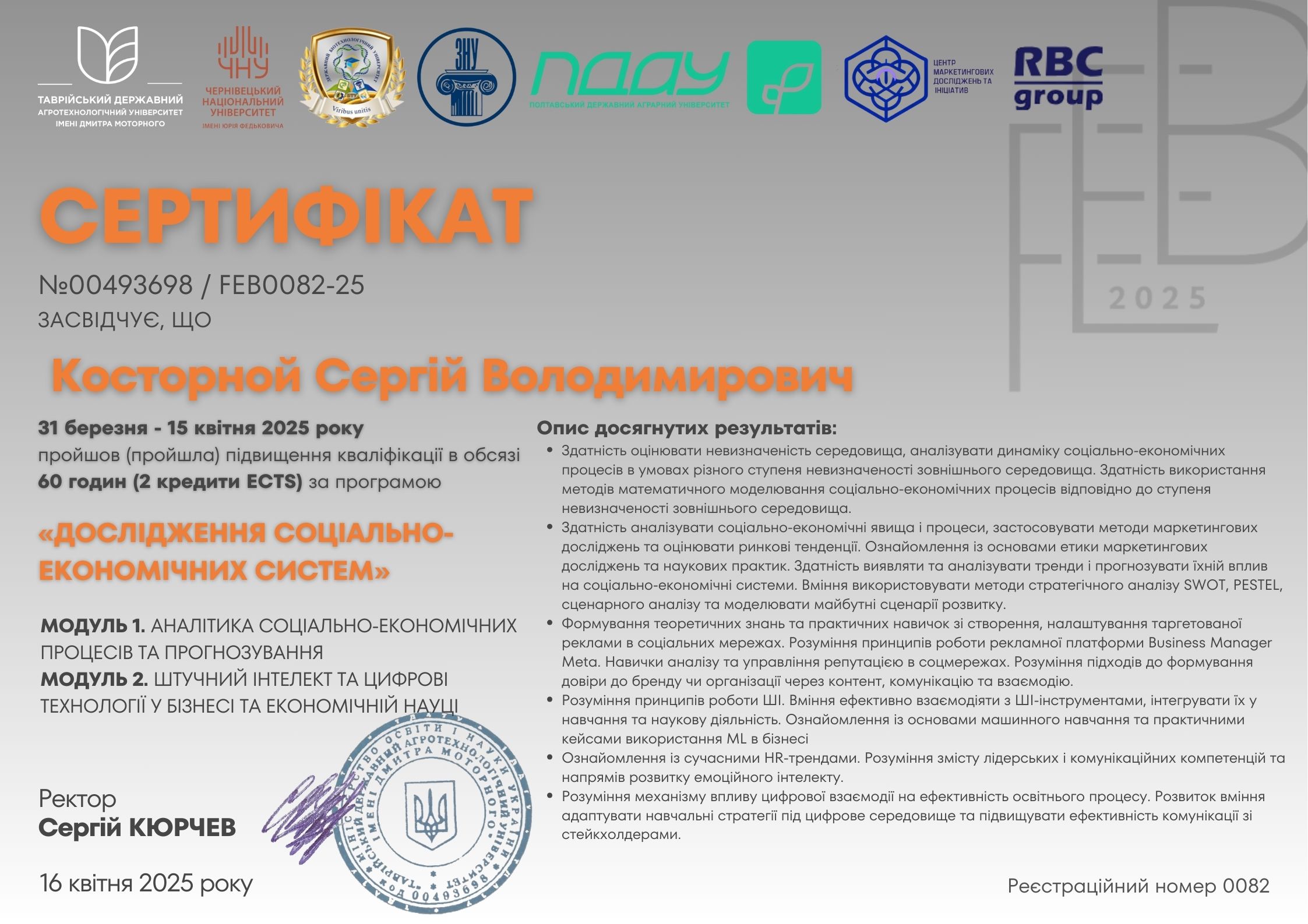 Prometheus. Сертифікат про завершення курсу, виданий 01.10.2024 р. Тема: «Основи корпоративних фінансів», обсягом 9 годин (0,3 кредиту ЄКТС). Визнано підвищенням кваліфікації (наказ ректора ТДАТУ №79-ІПК від 07.04.2025 р.)