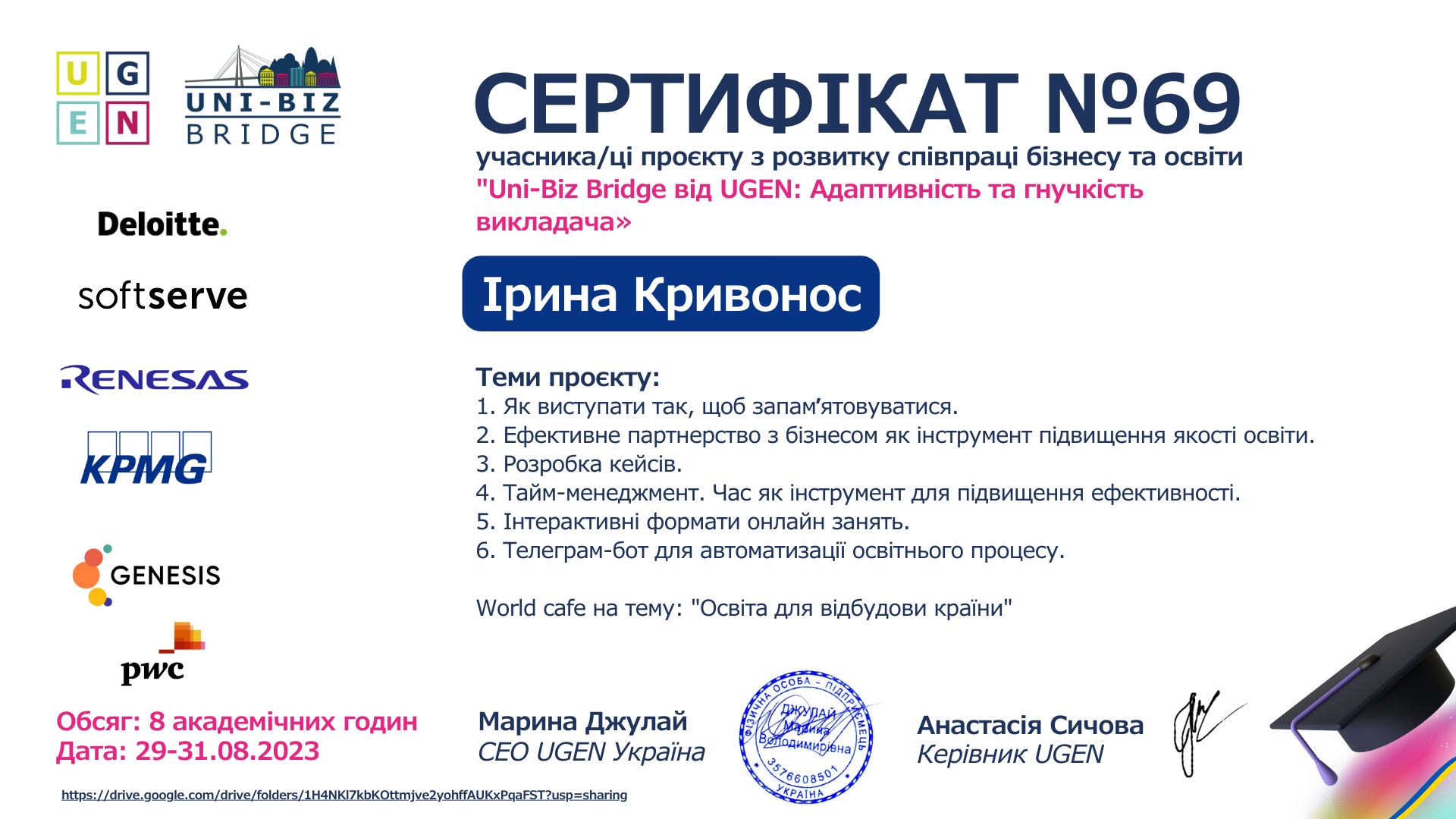 UGEN (м. Київ, Україна). Сертифікат про участь у проєкті № 69 від 31.08.2023р. Тема: “Uni-Biz Bridge від UGEN: Адаптивність та гнучкість викладача”, обсягом 8 годин (0,27 кредиту ЄКТС).Визнано підвищенням кваліфікації (наказ №382-ІПК від 24.09.2024 р.)