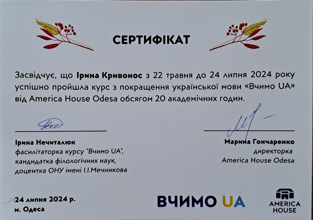 America House Odesa (м. Одеса, Україна). Сертифікат про завершення курсу, виданий 24.07.2024 р. Тема: «Вчимо UA», обсягом 20 годин (0,7 кредиту ЄКТС). Визнано підвищенням кваліфікації (наказ ректора № 243-ІПК від 30.06.2025 р.)