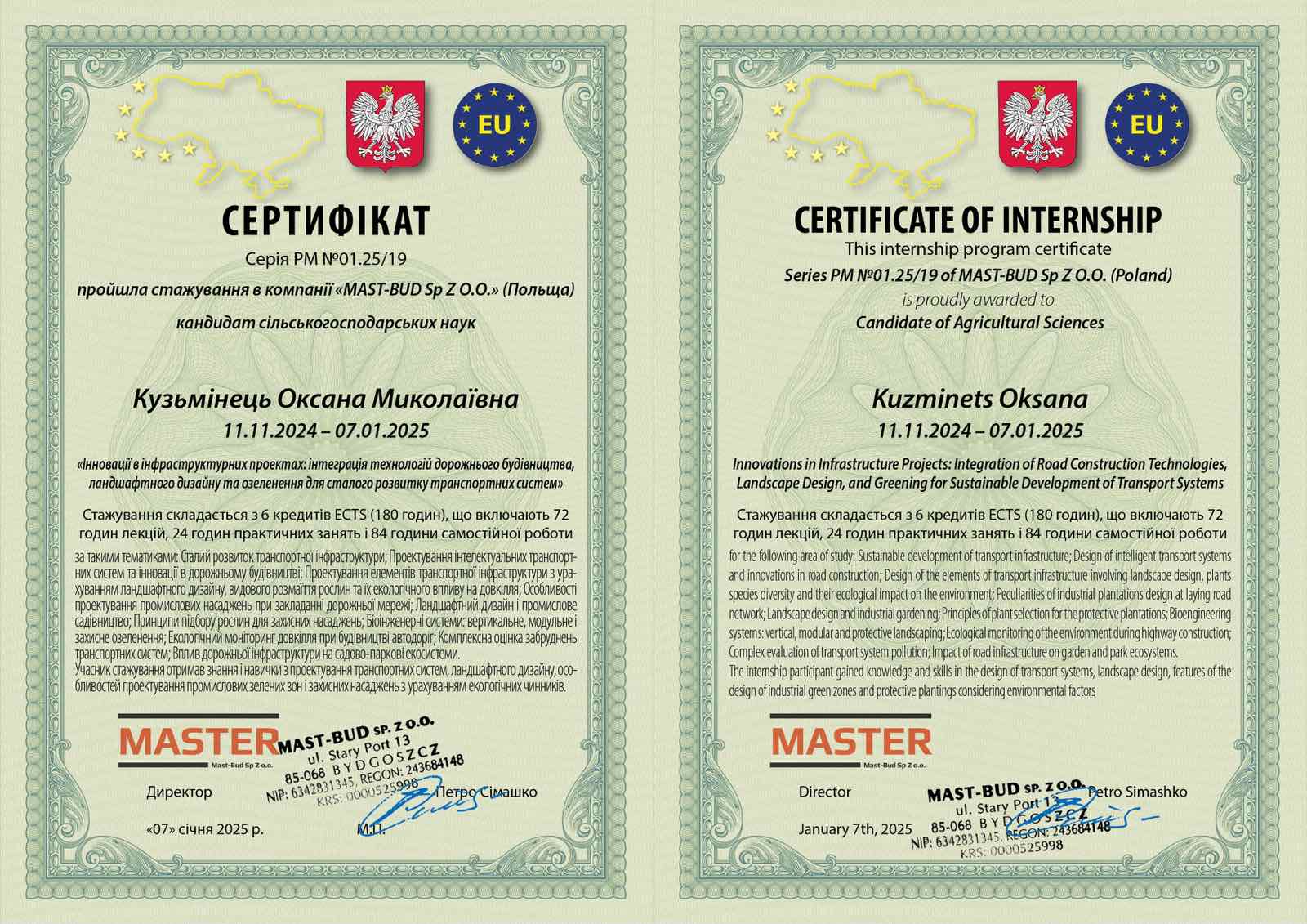 Міжнародне стажування. MAST-BUD Sp Z O.O. (Warsaw, Польща). Сертифікат про міжнародне стажування РМ № 01.25/19 від 01.01.2025 р. Тема: «Інновації в інфраструктурних проектах: інтеграція технологій дорожнього будівництва, ландшафтного дизайну та озеленення для сталого розвитку транспортних систем», обсягом 180 годин (6 кредитів ЄКТС). Визнано підвищенням кваліфікації (наказ ректора ТДАТУ №82-ІПК від 07.04.2025 р.)