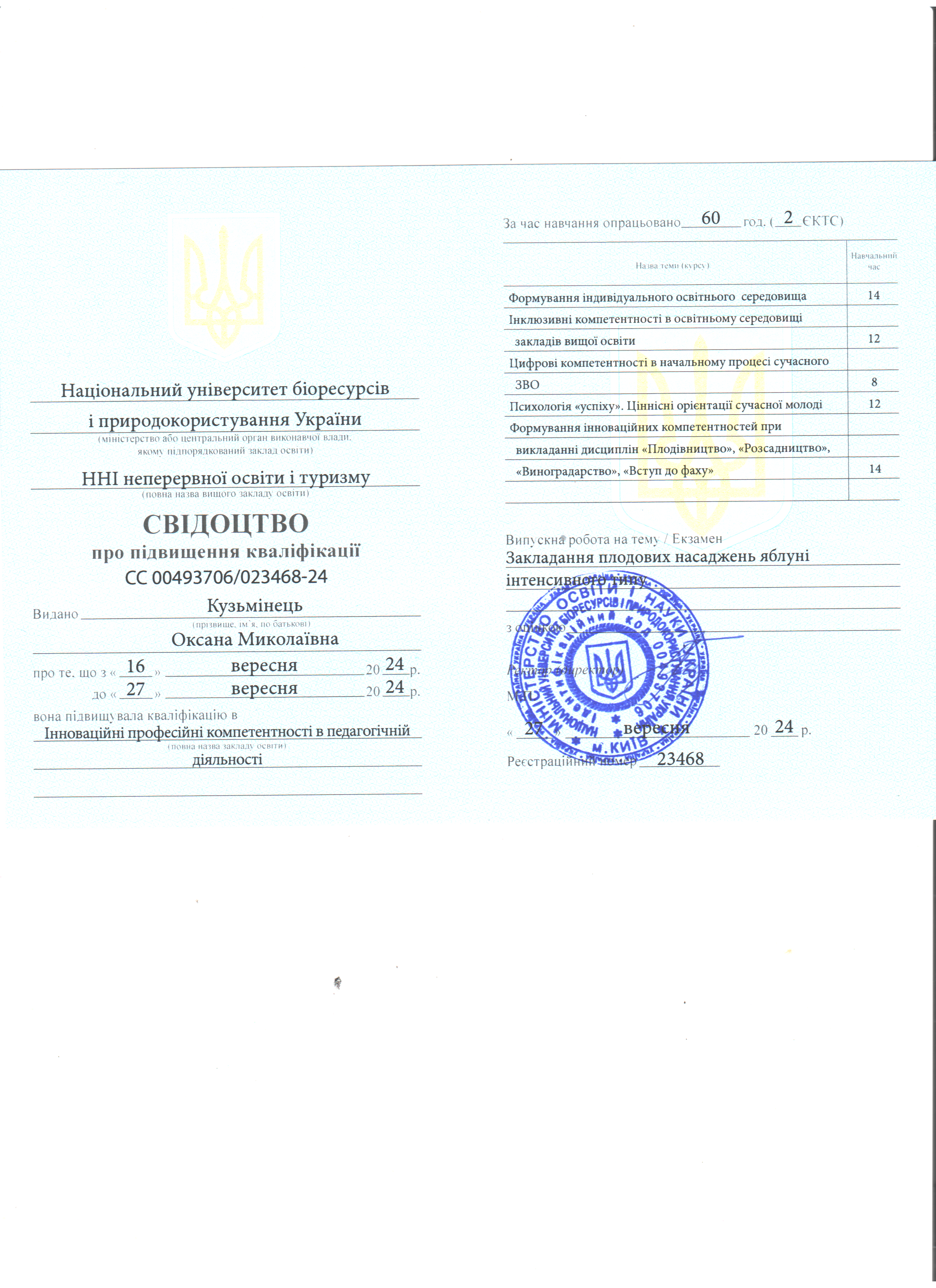 ГО «Асоціація “Український клуб аграрного бізнесу”» (м. Київ, Україна), ОП «Агрокебети». Сертифікат про проходження онлайн-курсу, виданий 12.10.2023 р. Тема: «Агропідприємництво» (проєкт USAID «Економічна підтримка України»), обсягом 90 годин (3 кредити ЄКТС). Визнано підвищенням кваліфікації (наказ ректора ТДАТУ № 481-ІПК від 27.12.2024 р.)