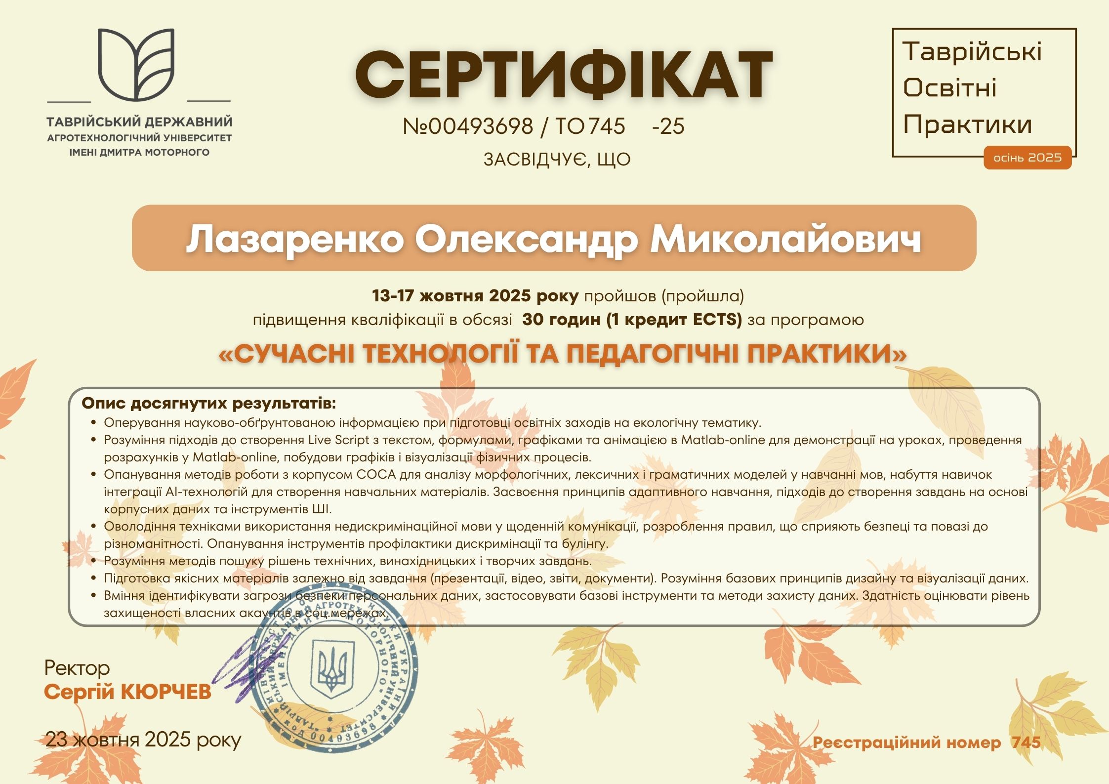 Лазаренко Олександр Миколайович Підвищення кваліфікації, стажування за останні 5 років 2025 рік Таврійський державний агротехнологічний університет ім. Дмитра Моторного (м.Запоріжжя, Україна). Сертифікат про підвищення кваліфікації №00493698/ТО0745-25 від 23.10.2025 р. Тема: “Сучасні технології та педагогічні практики”, обсягом 30 годин (1 кредит ЄКТС). Підвищення кваліфікації у попередні періоди —