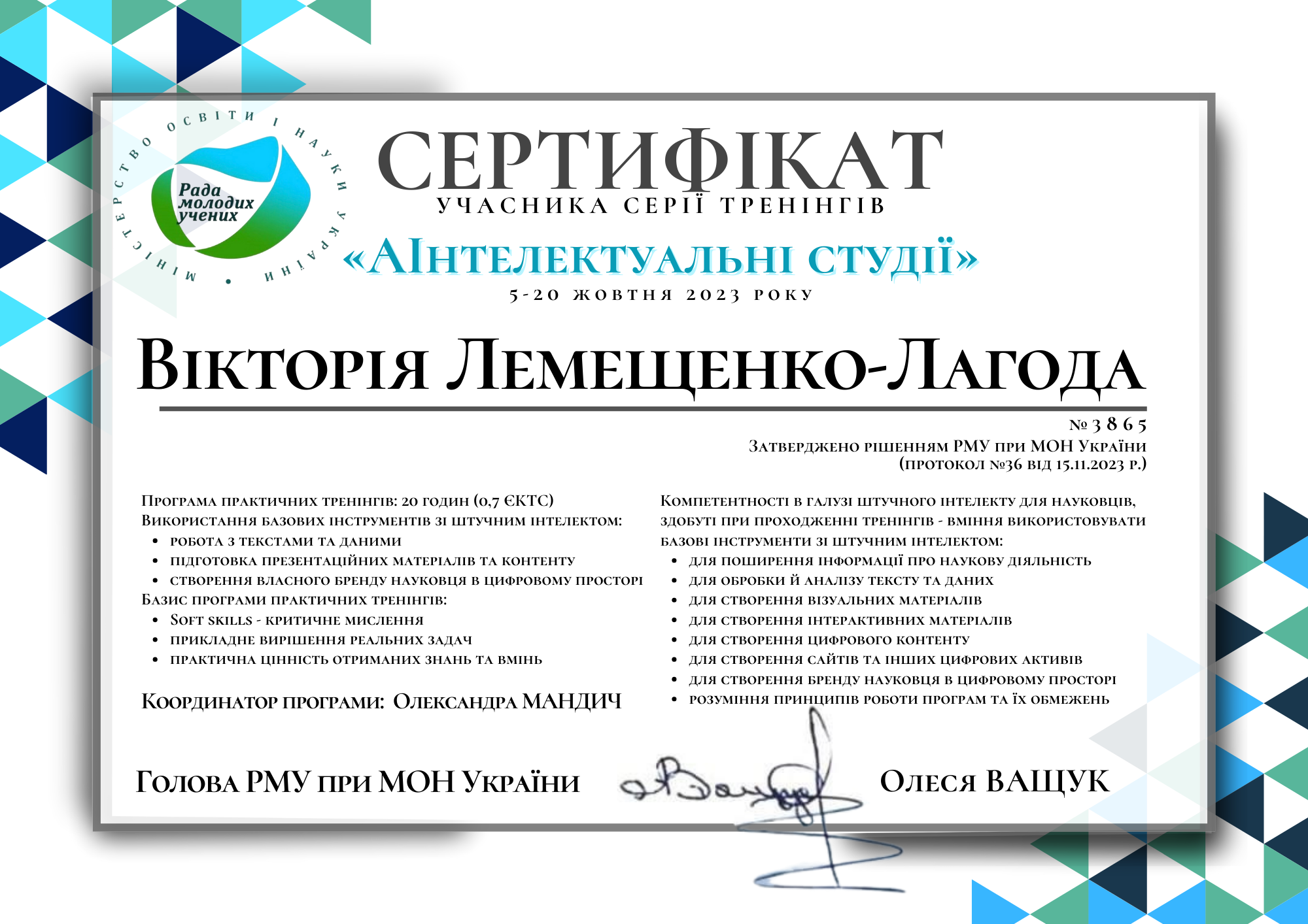 МОН «Рада молодих учених» (м.Київ, Україна). Сертифікат про завершення тренінгу №3865 від 20.10.2023 р. Тема: «АІнтелектуальні студії», обсягом 20 годин (0,7 кредиту ЄКТС)