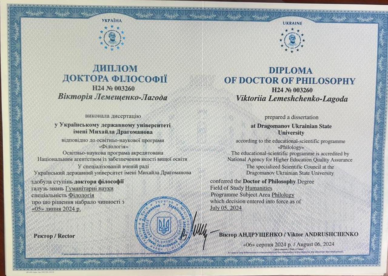 Здобуття наукового ступеня. Український державний університет ім. Михайла Драгоманова (м.Київ, Україна). Диплом доктора філософії Н24 003260 від 05.07.2024 р. Освітня програма: «Філологія», обсягом 3 кредити ЄКТС.Визнано підвищенням кваліфікації (наказ ректора ТДАТУ № 481-ІПК від 27.12.2024 р.)