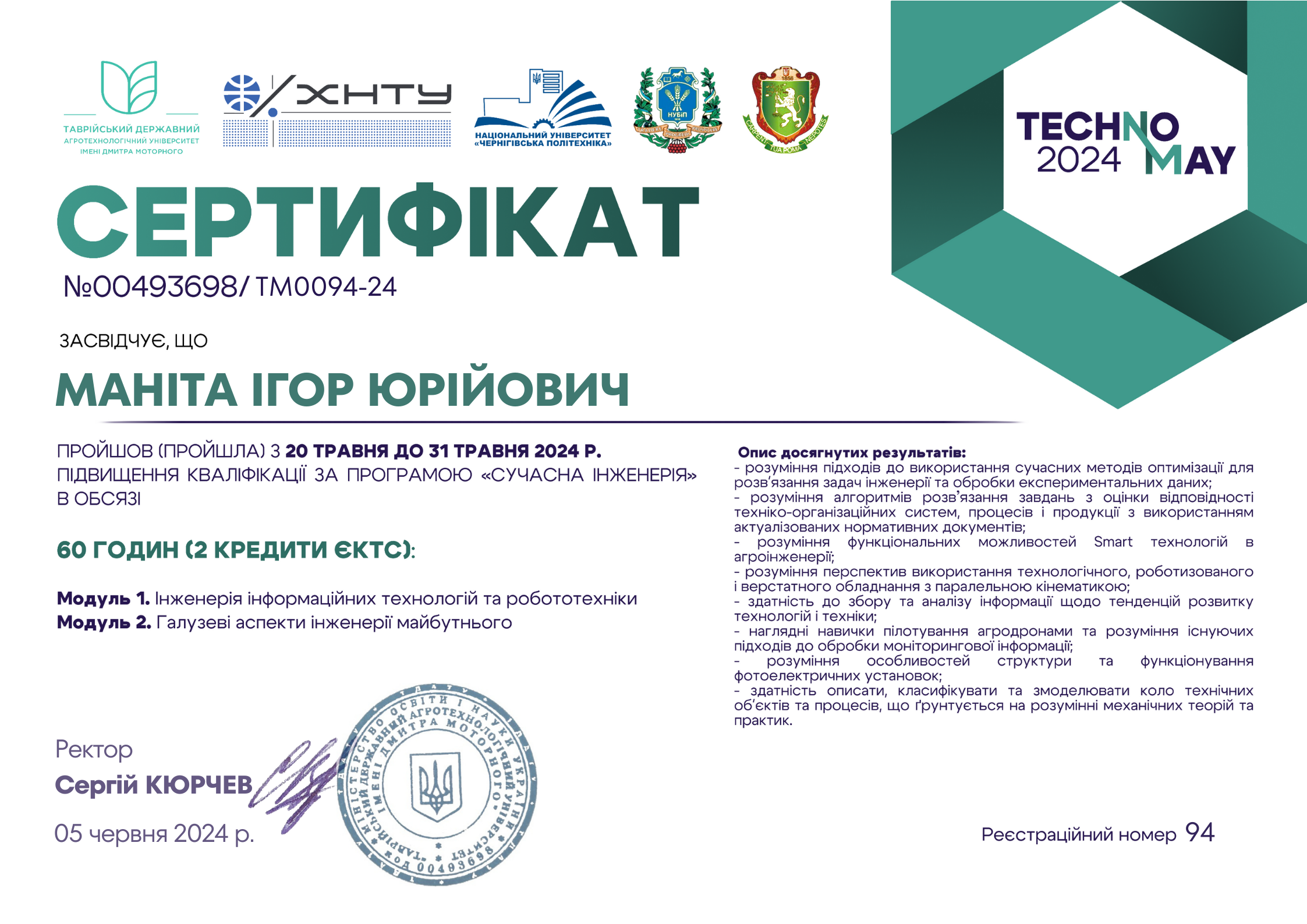 Таврійський державний агротехнологічний університет імені Дмитра Моторного (м. Запоріжжя, Україна), ХНТУ (м. Херсон, Україна), НУБіП (м. Київ, Україна), Львівський національний університет природокористування (м. Львів, Україна), Національний університет «Чернігівська політехника» (м. Чернігів, Україна). Сертифікат про підвищення кваліфікації №00493698/TM0094-24 від 05.06.2024 р. Тема: «Сучасна інженерія», обсягом 60 годин (2 кредити ЄКТС).