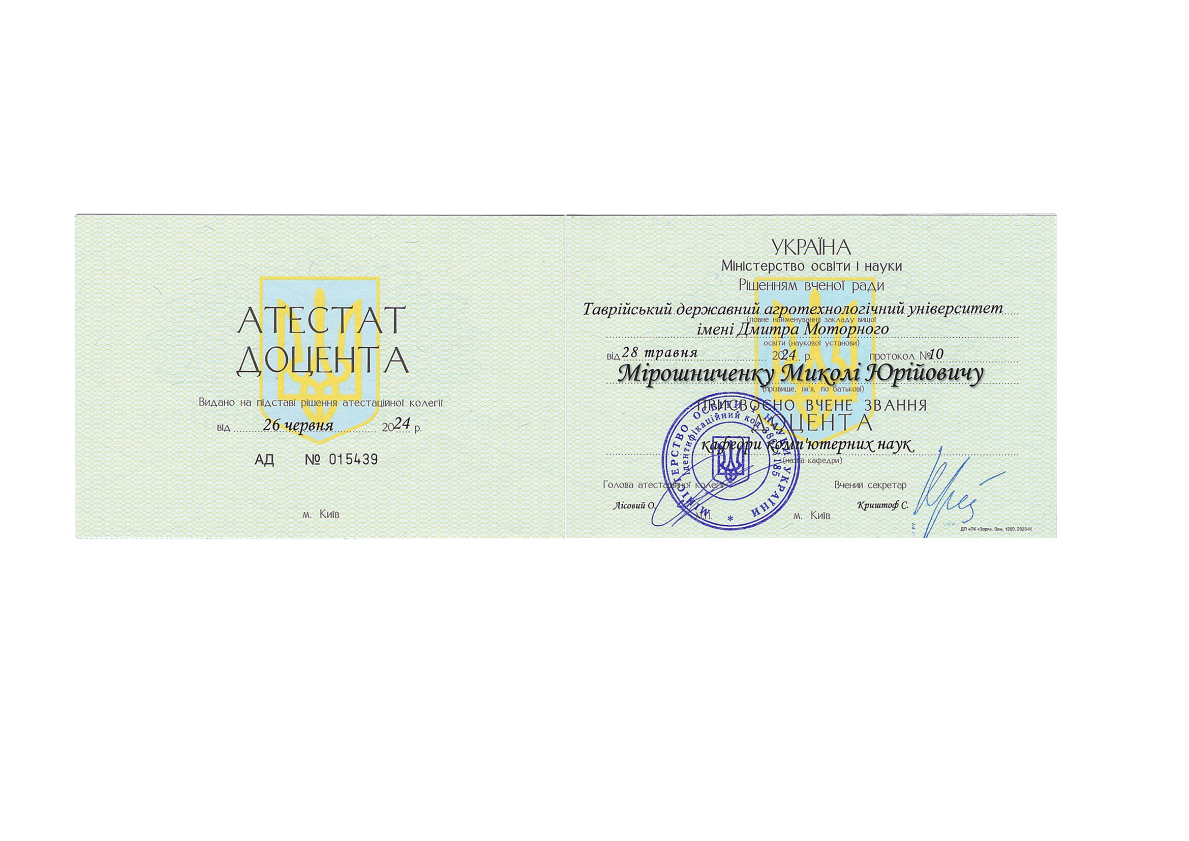 Отримання вченого звання. Міністерство освіти і науки України (м.Київ, Україна). Атестат доцента АД № 015439 від 26.06.2024 р. Вчене звання: «Доцент кафедри комп’ютерних наук», обсягом 3 кредити ЄКТС. Визнано підвищенням кваліфікації (наказ ректора ТДАТУ № 481-ІПК від 27.12.2024 р.)