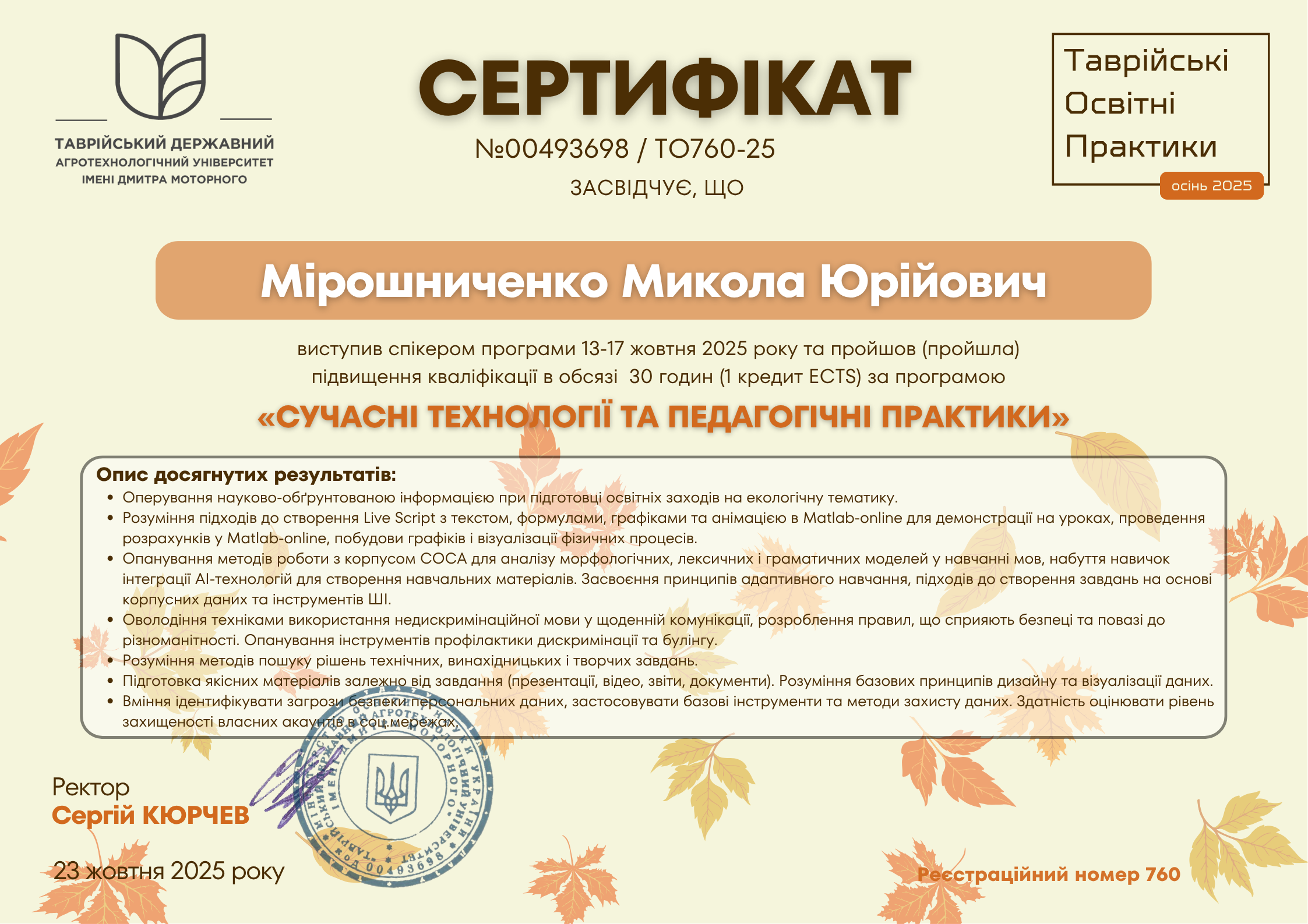 Таврійський державний агротехнологічний університет ім. Дмитра Моторного (м.Запоріжжя, Україна). Сертифікат про підвищення кваліфікації №00493698/ТО0760-25 від 23.10.2025 р. Тема: “Сучасні технології та педагогічні практики”, обсягом 30 годин (1 кредит ЄКТС).