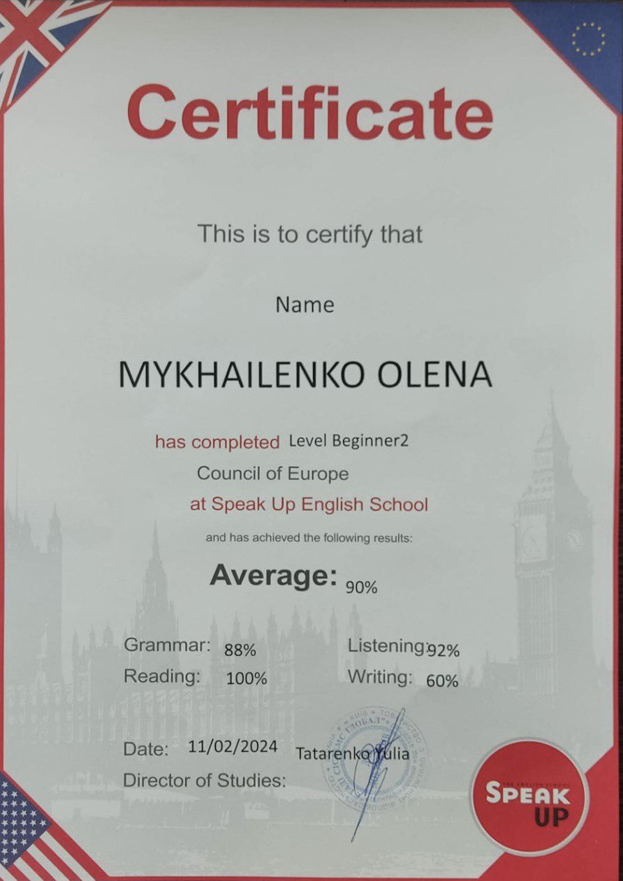 Speak Up (м. Київ, Україна). Сертифікат про завершення мовних курсів, виданий 11.02.2024 р. Тема: “Англійська рівень Вeginner 2” (обсягом 1 кредит ЄКТС). Визнано підвищенням кваліфікації (наказ №280-ІПК від 28.06.2024 р.)