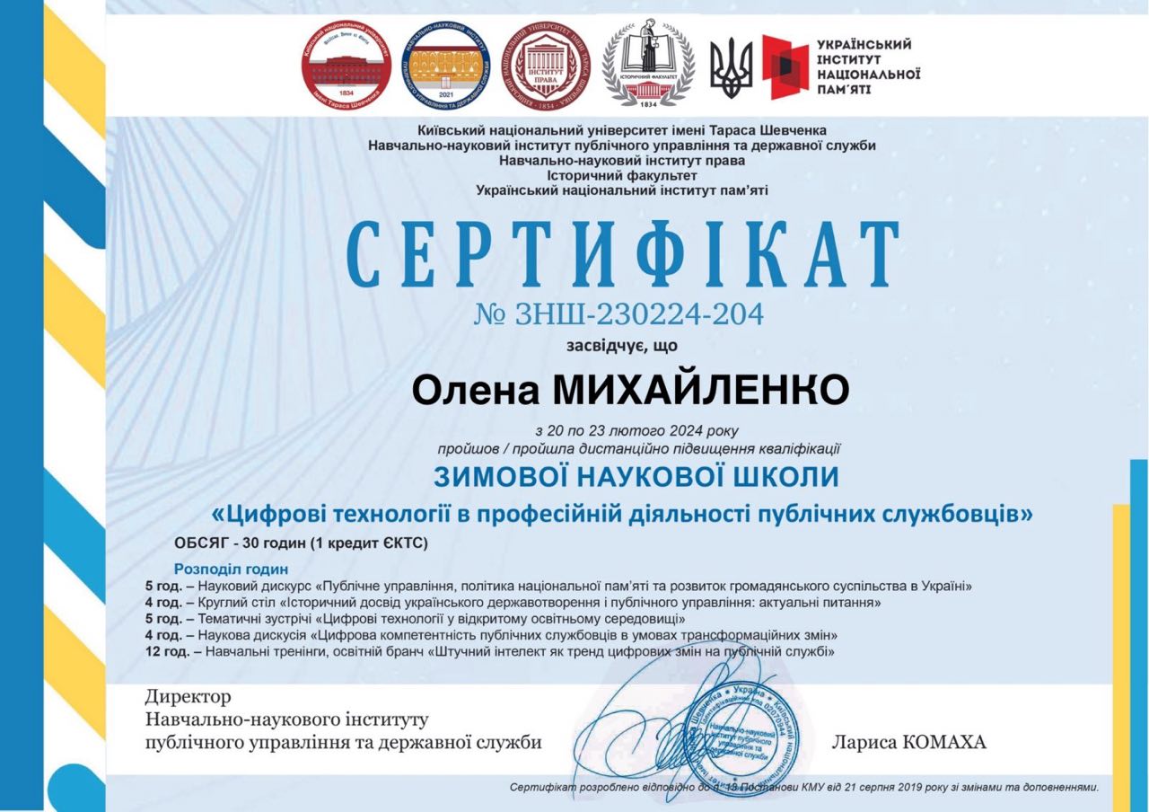 Київський національний університет імені Тараса Шевченка. ННІ публічного управління та державної служби (М. Київ, Україна). Сертифікат про підвищення кваліфікації у Зимовій науковій школі № ЗНШ-230224-204, від 23.02.2024 р. Тема: “Цифрові технології в професійній діяльності публічних службовців”, обсягом 30 годин (1 кредит ЄКТС). Визнано підвищенням кваліфікації (наказ №280-ІПК від 28.06.2024 р.)
