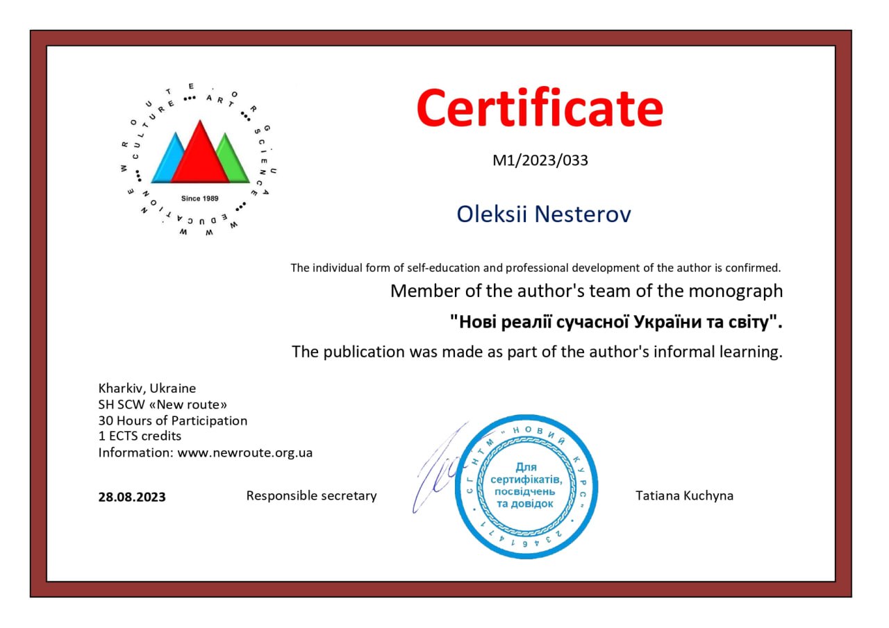СГ НТМ «Новий курс» (м. Харків, Україна). Сертифікат про підвищення кваліфікації № М/2023/6/033 від 28.08.2023 р. Тема «Нові реалії сучасної України та світу», обсягом 30 годин (1 кредит ЄКТС). Визнано підвищенням кваліфікації (наказ ректора ТДАТУ №104-ІПК від 31.05.2024 р.)