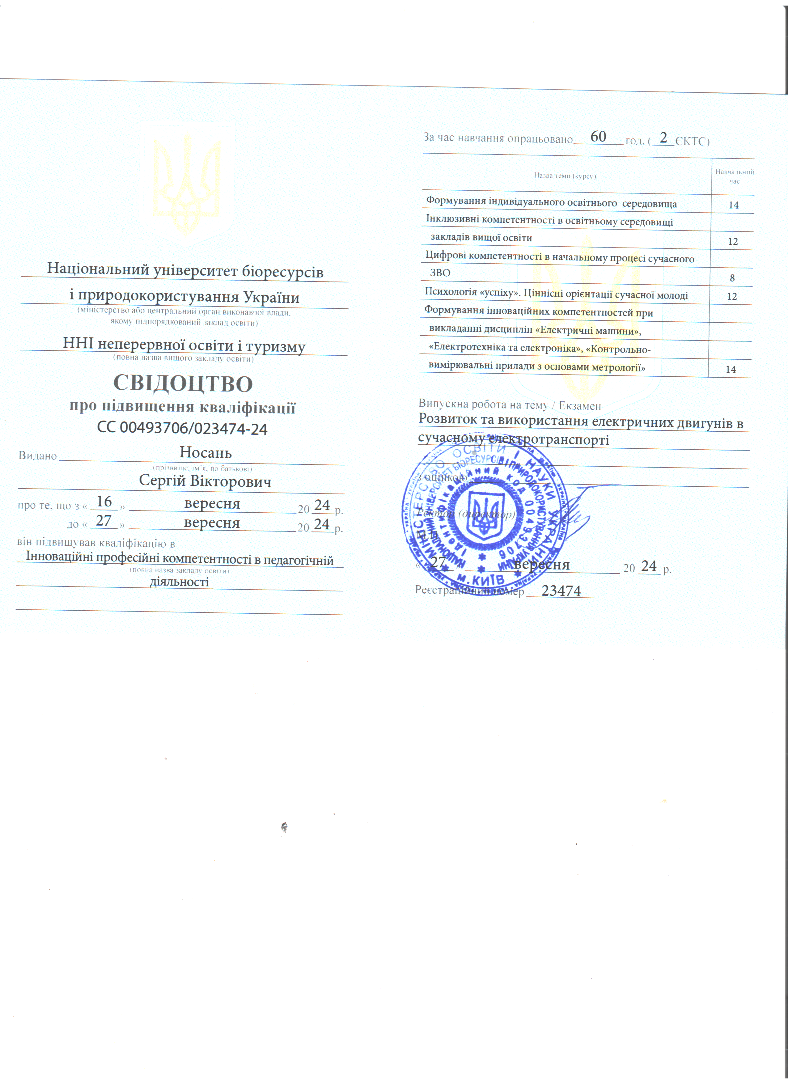Національний університет біоресурсів і природокористування України, ННІ неперервної освіти і туризму (м.Київ, Україна). Свідоцтво про підвищення кваліфікації СС 00493706/023474-24 №23474 від 27.09.2024 р. Тема: «Інноваційні професійні компетентності в педагогічній діяльності», обсягом 60 годин (2 кредити ЄКТС).