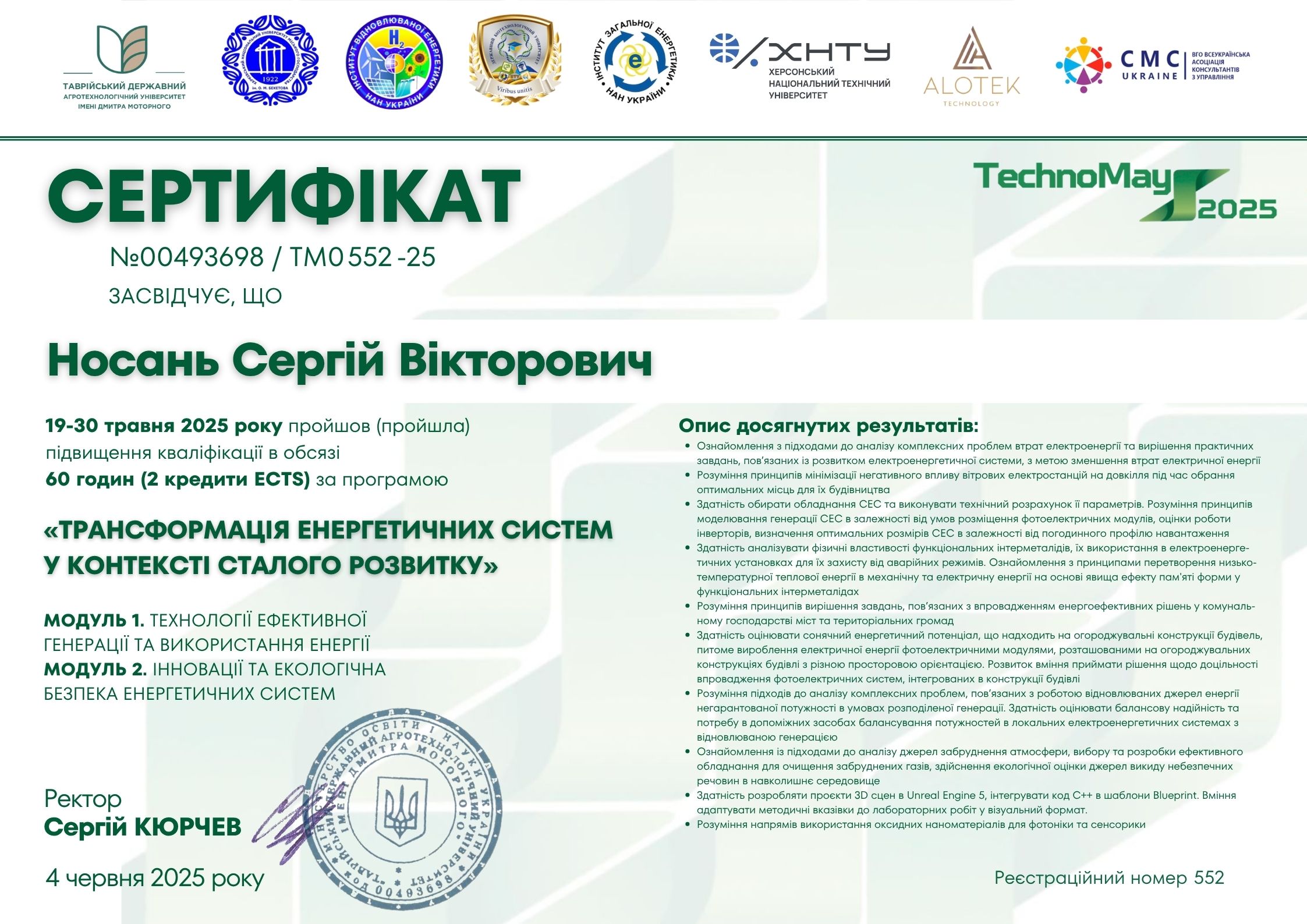 ТДАТУ (м. Запоріжжя, Україна), Інститут загальної енергетики НАН України (м. Київ, Україна), Інститут відновлюваної енергетики НАН України (м. Київ, Україна), ХНУМГ (м. Харків, Україна), ДБТУ (м. Харків, Україна), ХНТУ (м. Хмельницький , Україна) , ALOTEK (Польща), Всеукраїнська асоціація консультантів з управління CMC-Ukraine (м. Київ, Україна). Сертифікат №00493698 / ТМ0 552-25 від 04.06.2025 р. Тема: “Трансформація енергетичних систем у контексті сталого розвитку”, обсягом 60 годин (2 кредити ЄКТС).