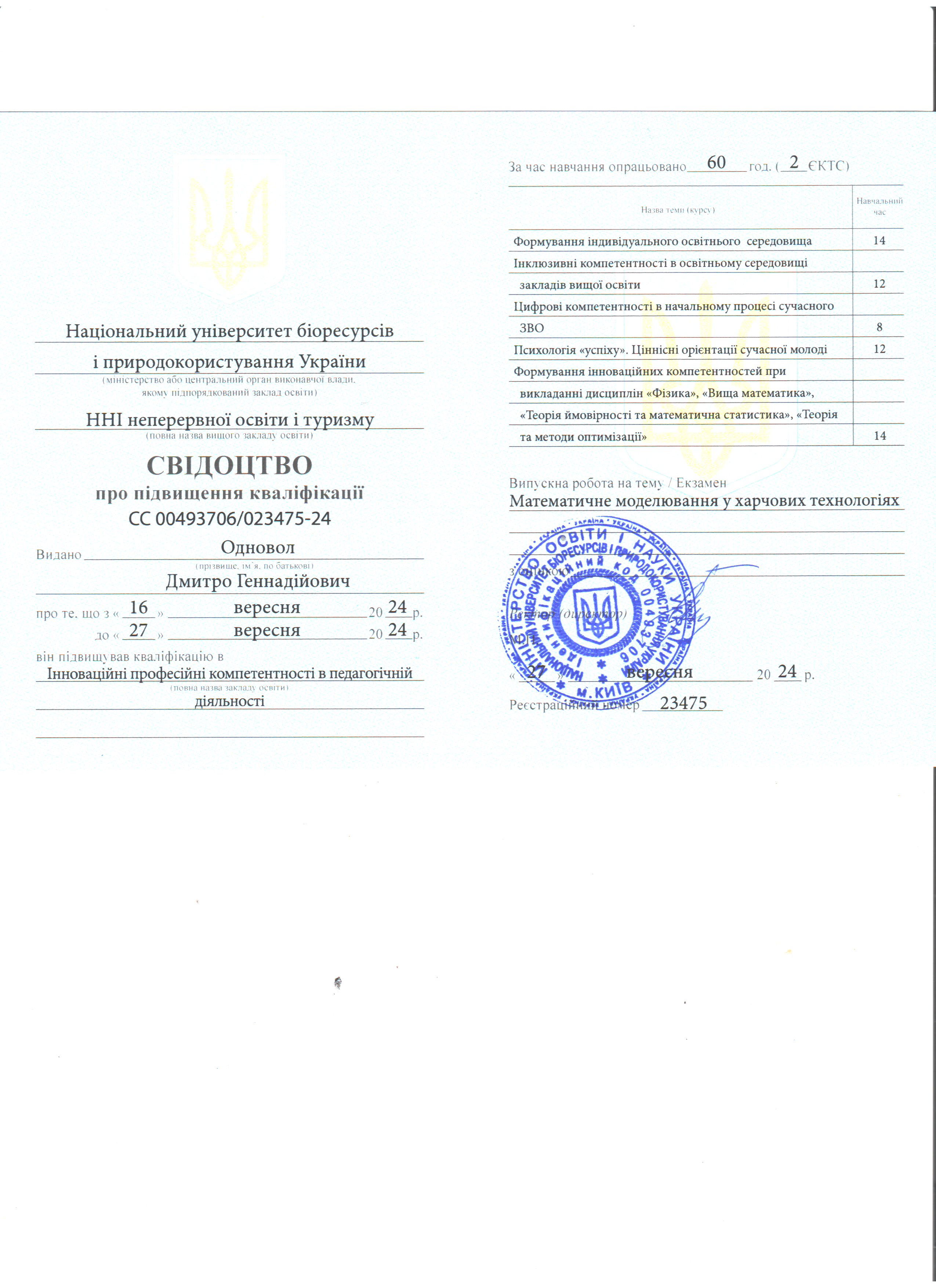 Національний університет біоресурсів і природокористування України, ННІ неперервної освіти і туризму (м.Київ, Україна). Свідоцтво про підвищення кваліфікації СС 00493706/023475-24 №23475 від 27.09.2024 р. Тема: «Інноваційні професійні компетентності в педагогічній діяльності», обсягом 60 годин (2 кредити ЄКТС).