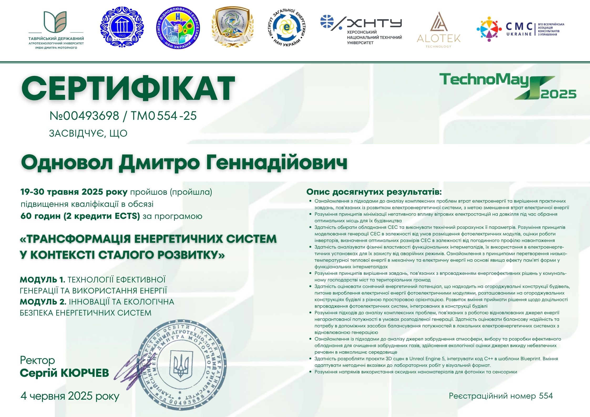 ТДАТУ (м. Запоріжжя, Україна), Інститут загальної енергетики НАН України (м. Київ, Україна), Інститут відновлюваної енергетики НАН України (м. Київ, Україна), ХНУМГ (м. Харків, Україна), ДБТУ (м. Харків, Україна), ХНТУ (м. Хмельницький , Україна) , ALOTEK (Польща), Всеукраїнська асоціація консультантів з управління CMC-Ukraine (м. Київ, Україна). Сертифікат №00493698 / ТМ0 478-25 від 04.06.2025 р. Тема: “Трансформація енергетичних систем у контексті сталого розвитку”, обсягом 60 годин (2 кредити ЄКТС).
